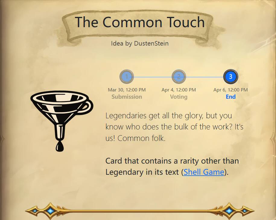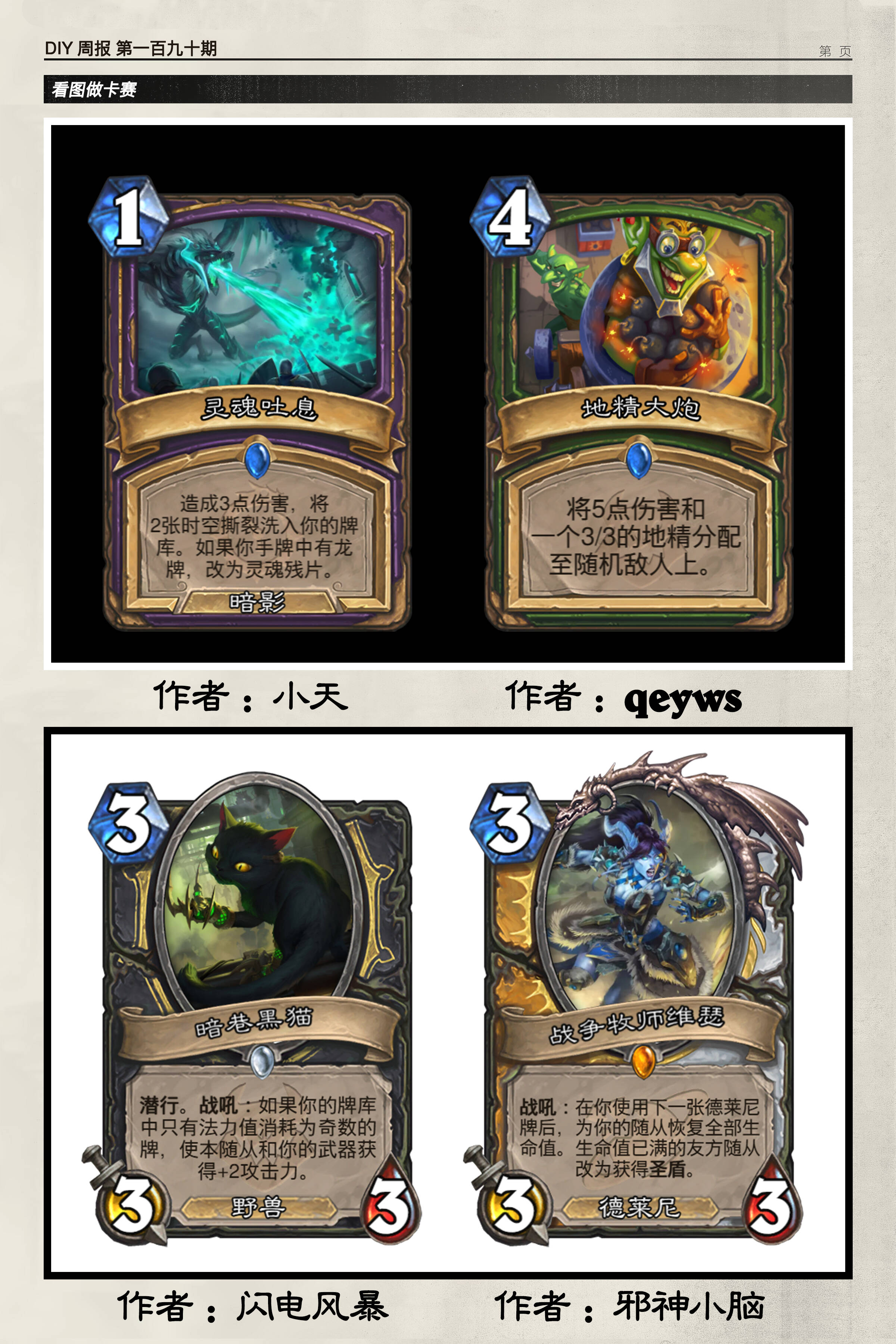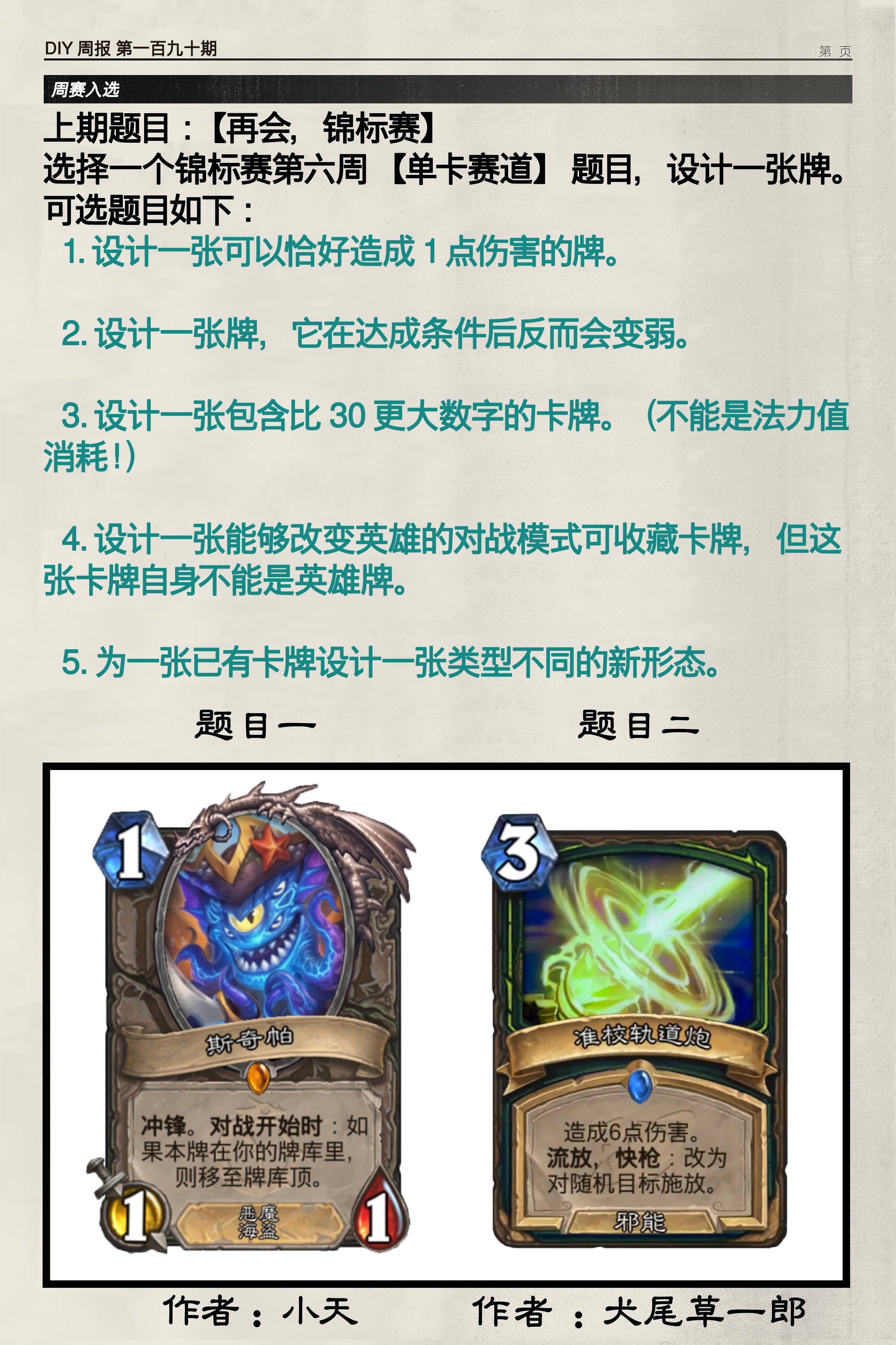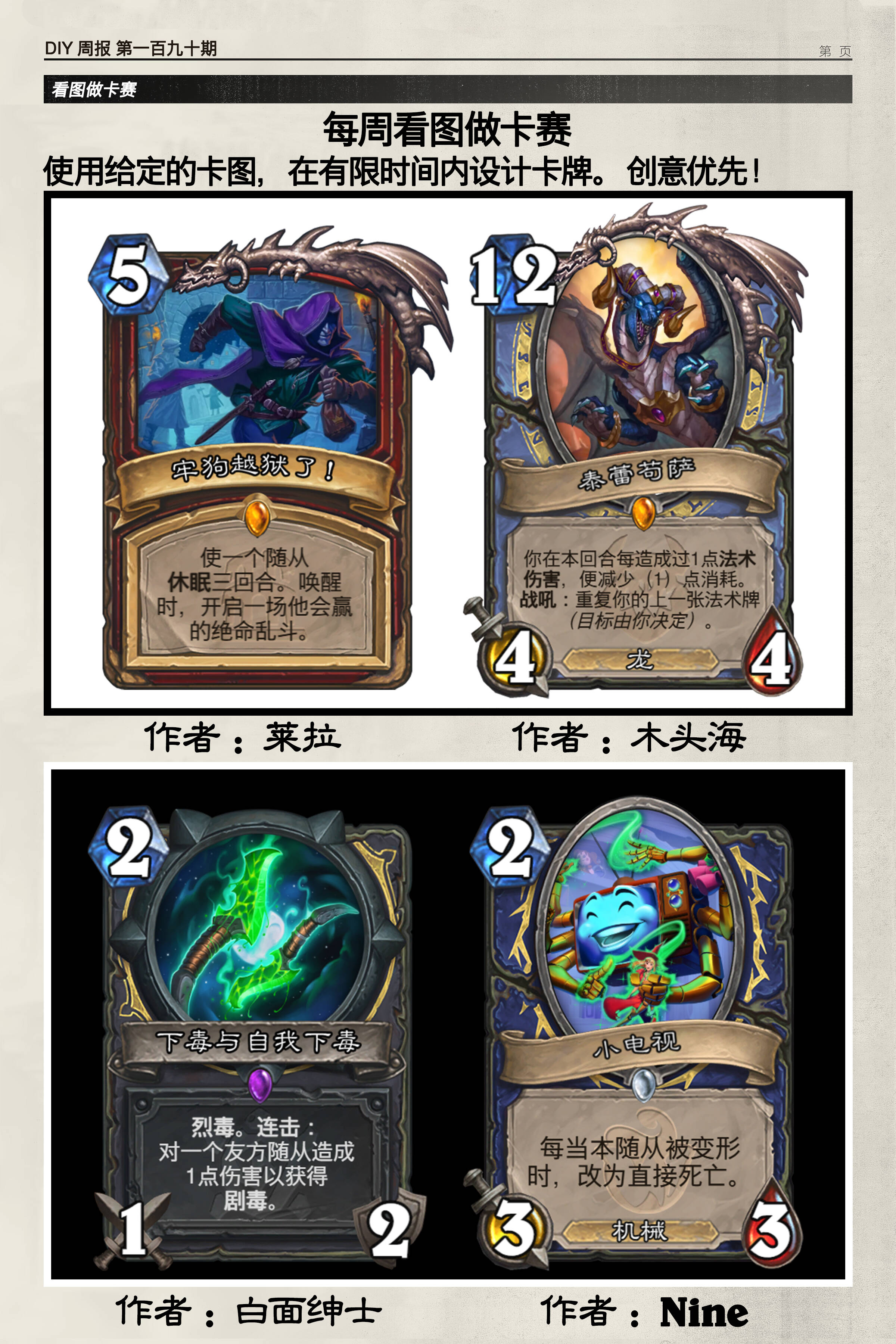 难得的朴实游戏性题目。可供的选择多,双职业又给予了一定的限制。 双职业卡的设计一向是diy的难点之一,即如何巧妙地融合双职业特色的同时又不显得生硬。以此这是一道有一定要求的题目,如果用心设计可能出现极为优秀的作品,可惜的是本题目下并没有十分出色的作品。