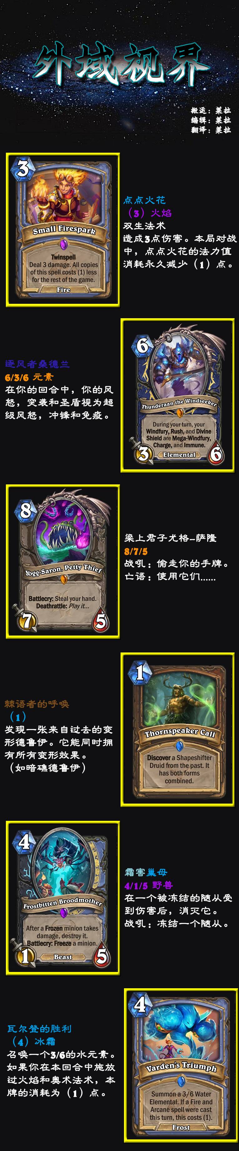 刻符者强度稍高。Dk设计有趣。觅潮者诡异。艾萨拉配刀无敌了。双重战刃不错。羽月烂,橙卡不止平庸,还很违和,世界别馈赠我了,德鲁伊卡牌联动缺乏,标本室有设计。声东击西恶性设计。落花之逝和看门爱犬过弱。埃兰之影和卡德加相似度过高。吉安娜无聊。寒冰宝珠太弱了。奥术传送不错。还在回溯战场。绅士风度有设计但不够顺滑。拉祖尔描述赘余。牧师制胜点不明晰。卡布斯描述赘余。盗贼不错。术士未免太独特了。腐化力量像三国杀。预见之眼过强。