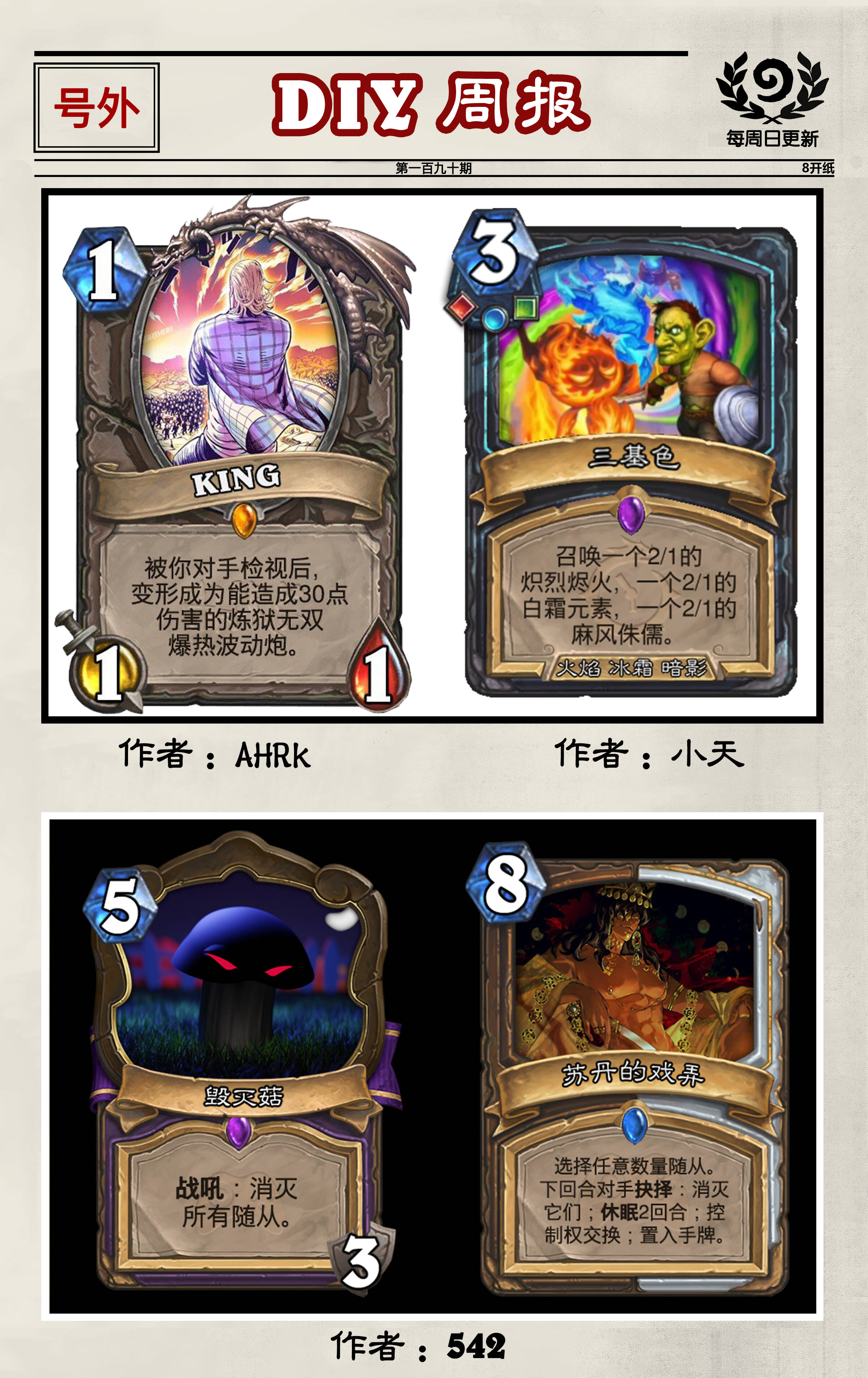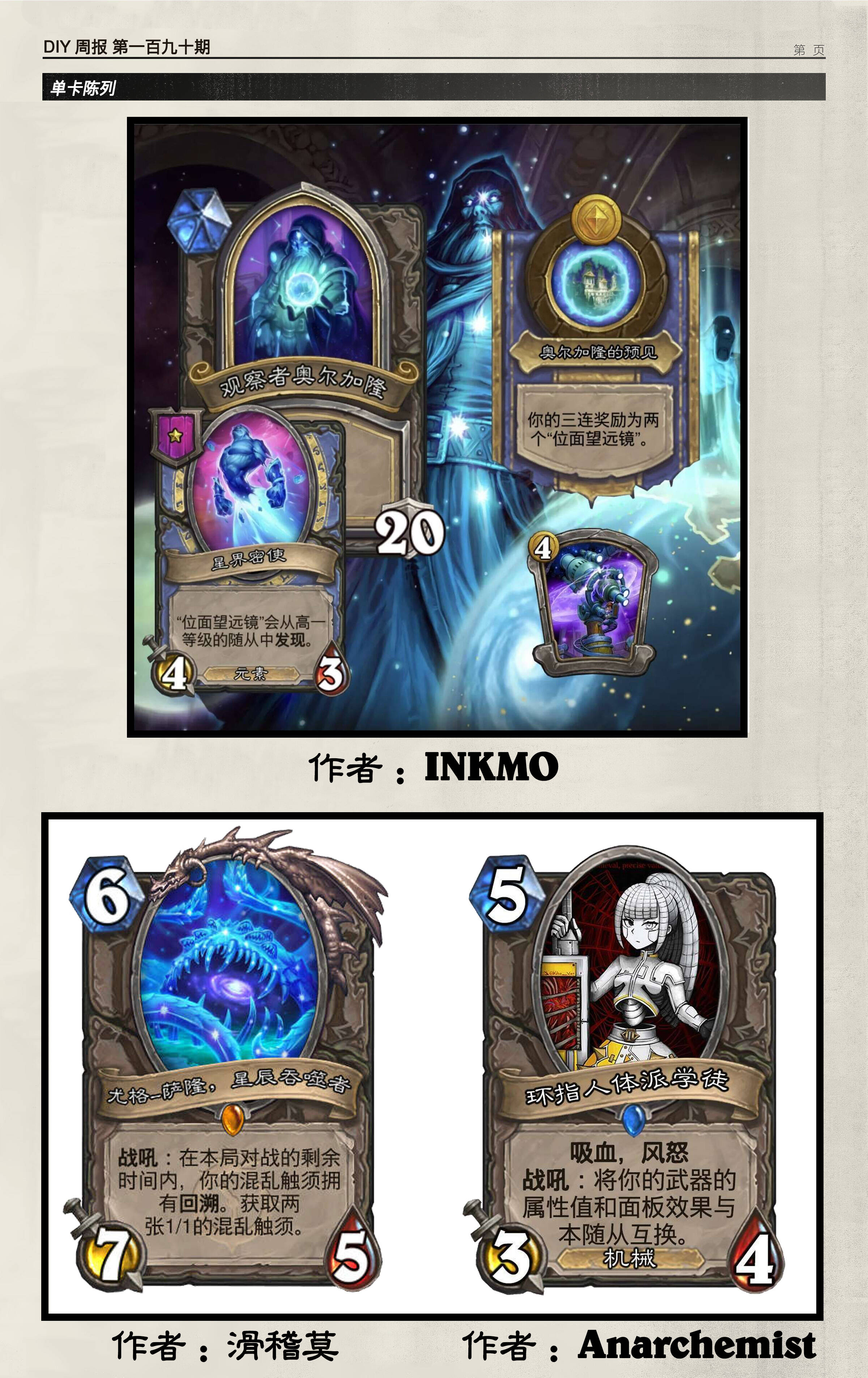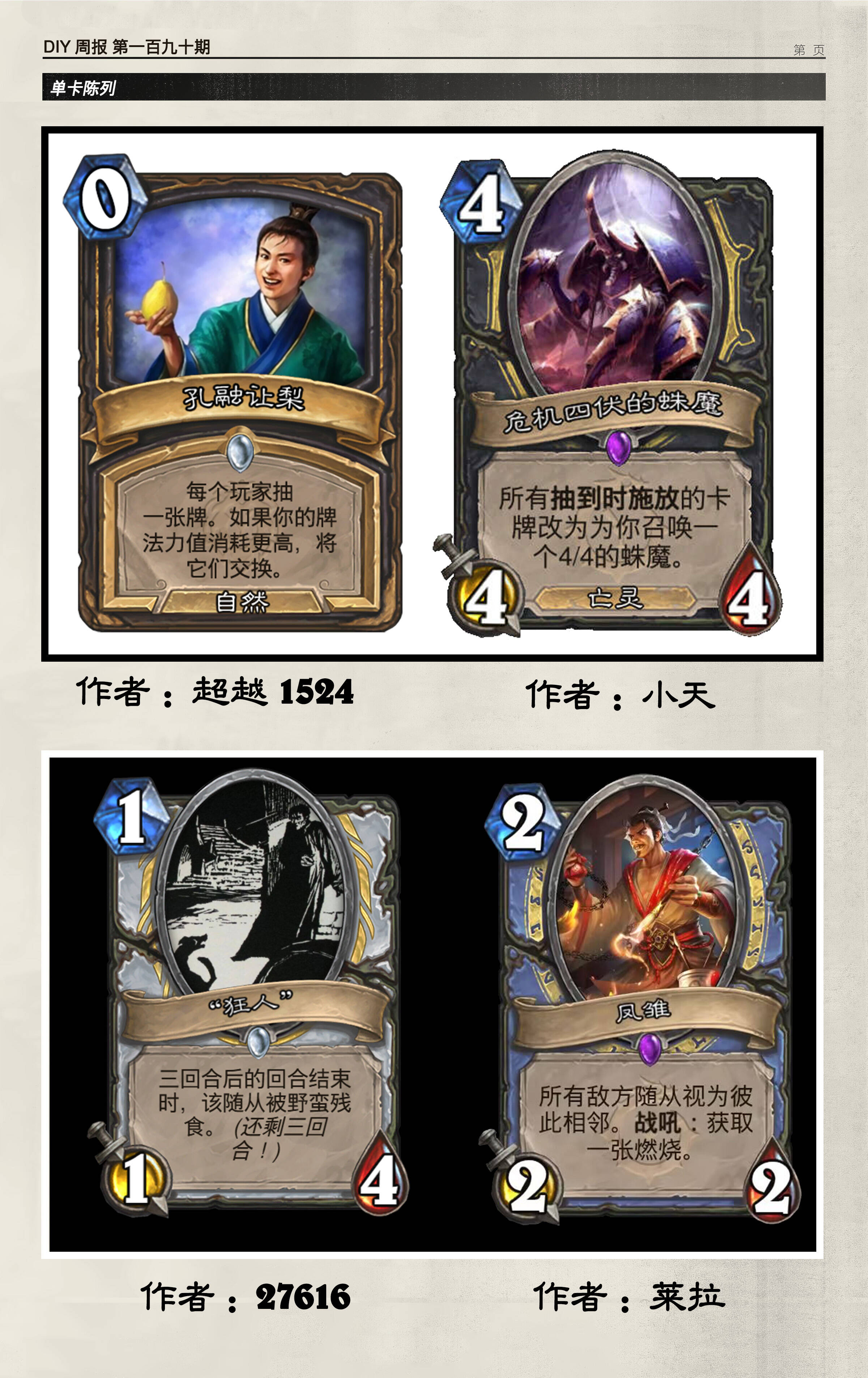 虽然对这个游戏缺少了解,但能从精心的设计和详尽的注释中感受到作者的热情和诚意。大部分职业的几张牌都有不错的内在配合,也能从备注中感受其契合和独特风味。不过也可惜限于小扩展篇幅有些思路未能尽善尽美地展现,如圣骑士有配合额外效果的单卡,却少了buff。总的来说瑕不掩瑜,也有甲壳虫女王等颇有趣,有风味的单卡,是精心打造的作品。
