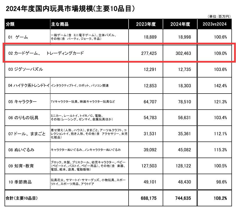 据日本玩具协会报告,2024 年度日本 TCG 市场规模达 3024亿日元,创下历史新高。