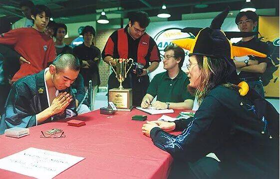小丑帽与僧侣袈裟的服装对决。右侧为中村聪先生(1998 年 / 引自《万智牌》官方网站)