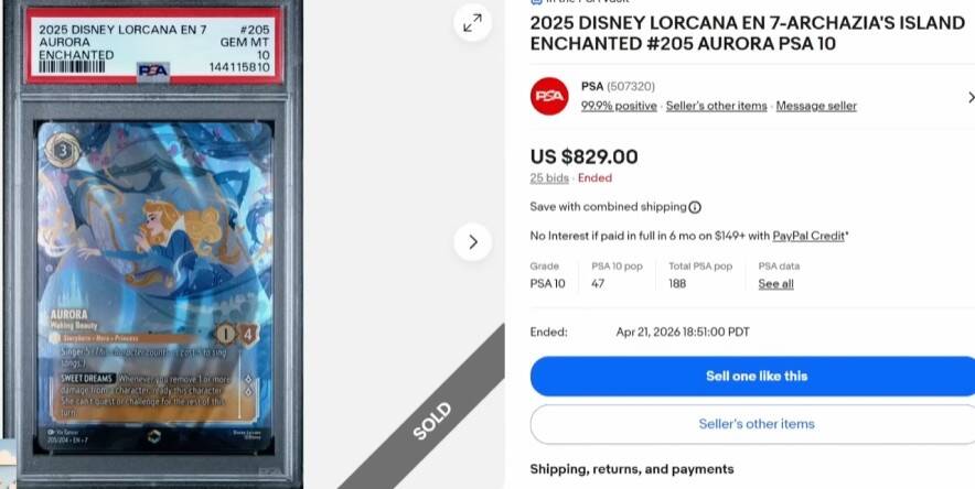单卡市场方面,Aurora - Dreaming Beauty 的 PSA 10 评分数量(Pop Report)极低(仅约 47 张),导致成交价飙升。这并非因为卡片本身稀少,而是该系列发布时,送评 Lorcana 尚未形成风气。这种由于历史原因形成的“高分稀缺性”,让它成为了顶级的“奖杯卡”。