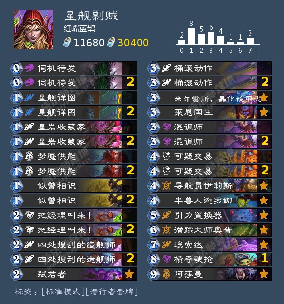 2.为什么偷?答:因为别家的牌就是超模(哭),同时还有两点,一是对环境卡组熟悉的情况下,偷到什么能帮助我们了解对手的手牌资源来规划自己的打法,二是开星舰缺牌,这一点可能盗贼老玩家会有体会,过往玩很多构筑容易打到满手牌不好卸,但是开星舰完全不会,所以我要带阿莎曼一波拉满,所以也敢于选埃索达叠甲而不带回手体系