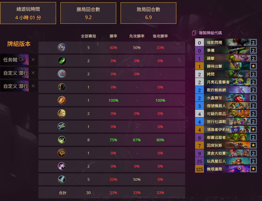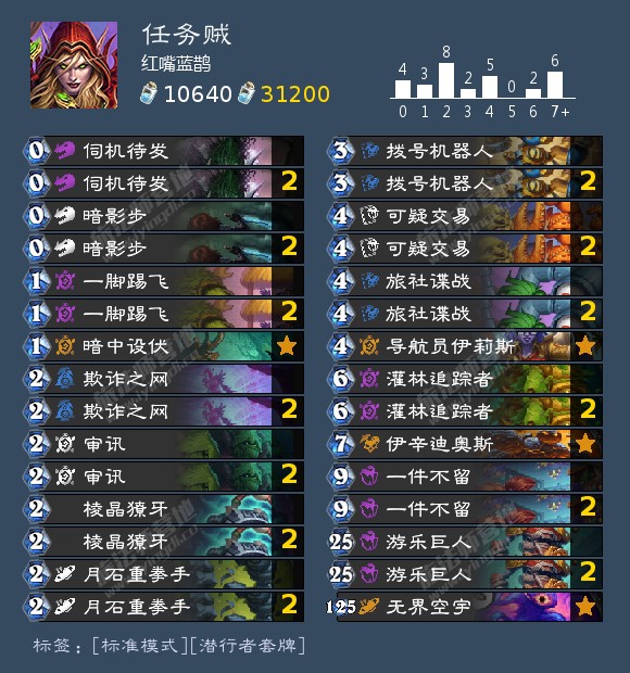 这套牌属于是狗尾续貂,是我在围绕伊利斯构筑的过程中,对于高费卡位如何合理填补的难题发现任务贼的组件刚好能用,所以才组出来这一套牌。任务贼本身的问题还是存在,任务奖励弱,乌龟卡格子,徒有潜行,以及围绕任务的构筑卡位太紧,没有办法带其他的优质组件。因此只跟大家做构筑分享,不推荐上分。