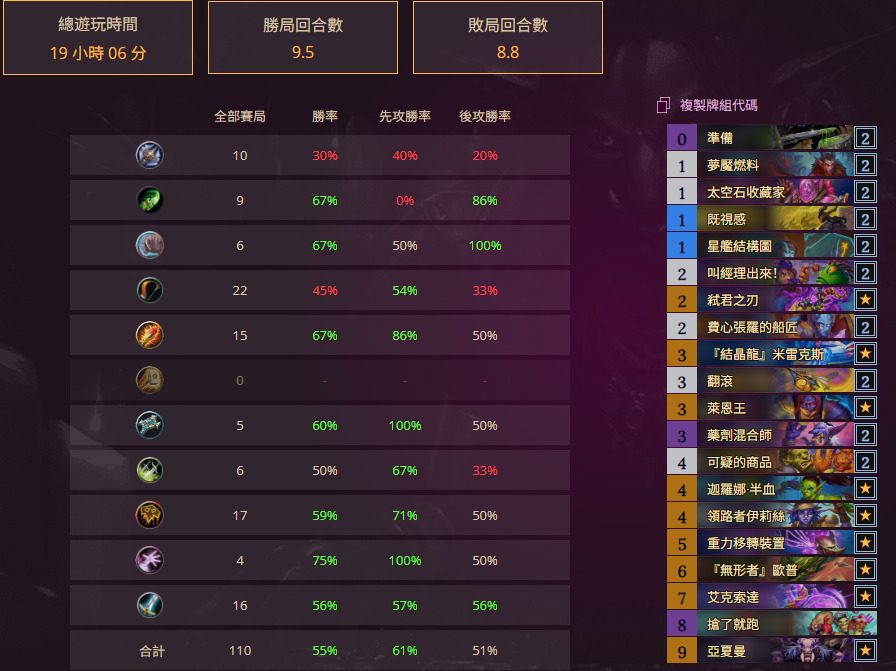 混调师是一张契合盗贼的好卡,复活随从契合星舰体系,全体加血保护场面,全场打二也是给了贼最稀缺的群解(虽然经常叫不到自己想要的选项T^T),来帮助处理萨猎的频率,偷到猎人的尼利我们也是发现猎~