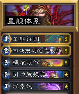 星舰体系最基本的作用就是提供前期站场,因此星舰详图和造舰师是起手留牌优先度很高的卡牌,值得注意的是星舰详图在前期有类似存一费的效果,规划打牌顺序时可以先想好大概要几费星舰来决定是否提前打;