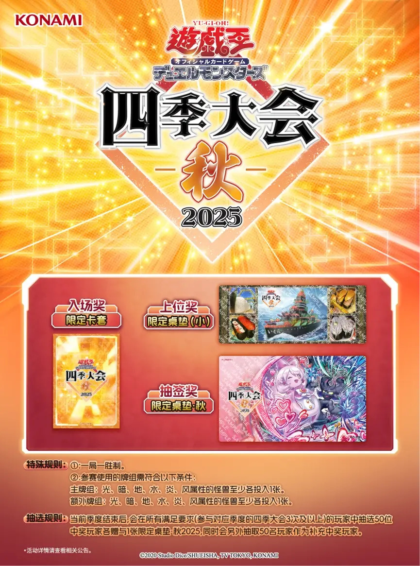 抽选规则:当前季度活动结束后(四季大会-秋结束日期:2026年2月8日),会在所有满足要求(参与对应季度的四季大会3次及以上)的玩家中随机抽选50位中奖玩家各赠与1张限定卡垫·秋,同时会另外抽取50名玩家作为补充中奖玩家。中奖玩家会在当前季度活动结束后10个工作日内以【一起来决斗】公告及消息通知的形式进行告知,若中奖玩家未在公告发布之日起5个工作日内按指示填写收货信息(收件地址仅限中国大陆地区),则会取消其中奖资格。剩余中奖名额将从补充中奖的玩家中按公告顺序补充到中奖名单中。