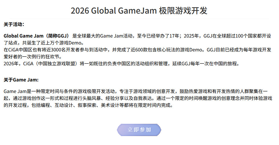 2026年CiGA中国独立游戏联盟即将迎来成立的第12年,从2015年1月23日的第一场Global Game Jam起,CiGA连续12年组织GGJ中国区的的活动。Game Jam这一活动形式也从小众,到如今广泛被开发者所熟知。