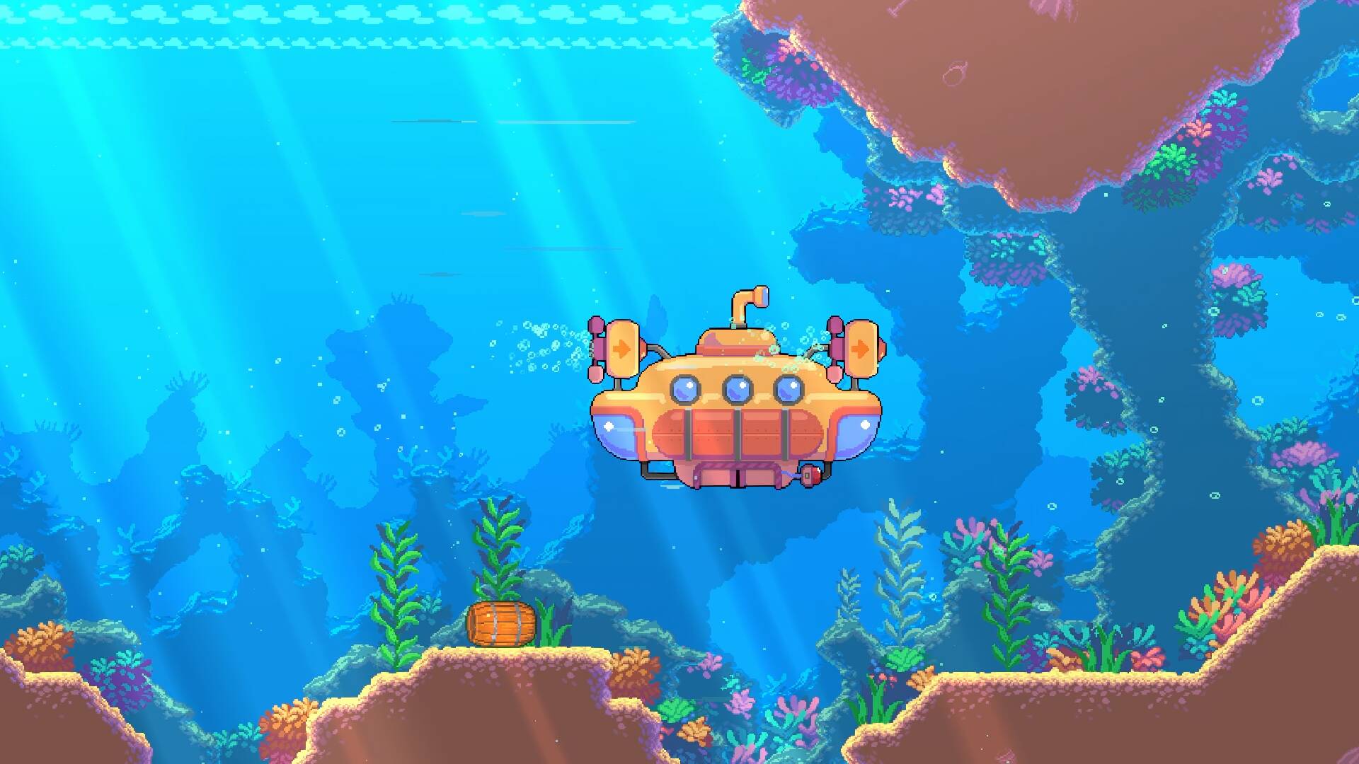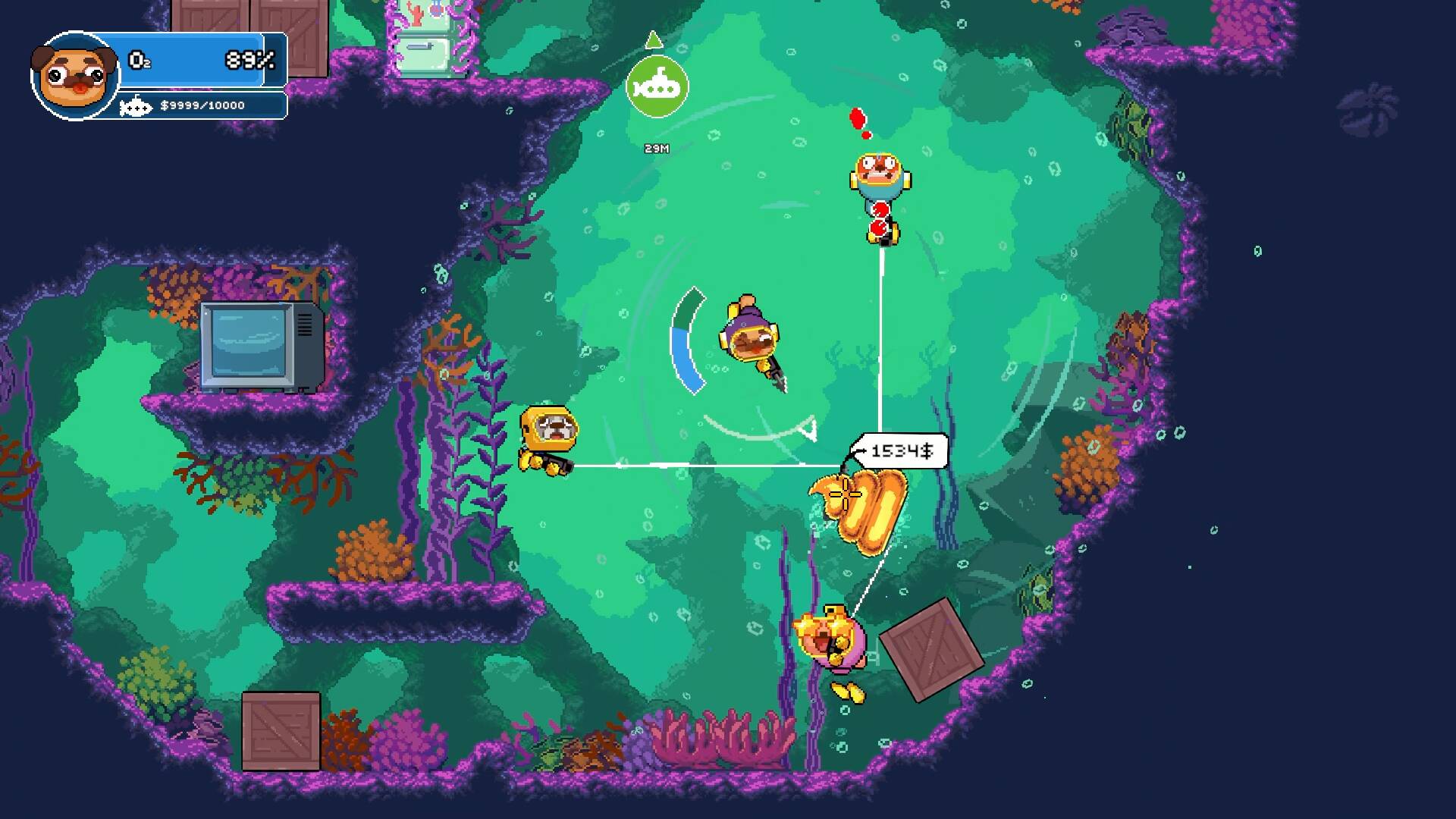 潜艇是你们的移动基地和交通工具。你可以从内部驾驶它,也可以从外部推着它穿过狭窄通道。卖掉战利品,升级装备,整装待发,再次下潜。