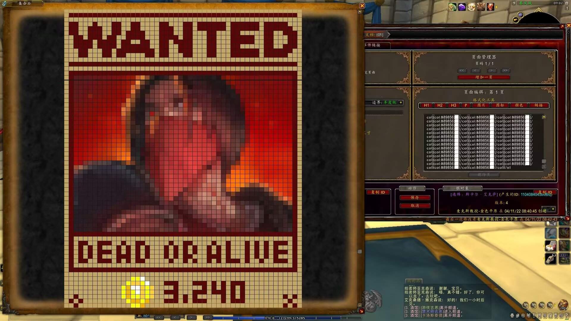同时,他的想象力还使像素画得以实现。通过像素方块染色的方法,他发明了魔兽世界内的像素作品,用宝图、悬赏令等形式大大提升玩家们的RP剧情代入感。