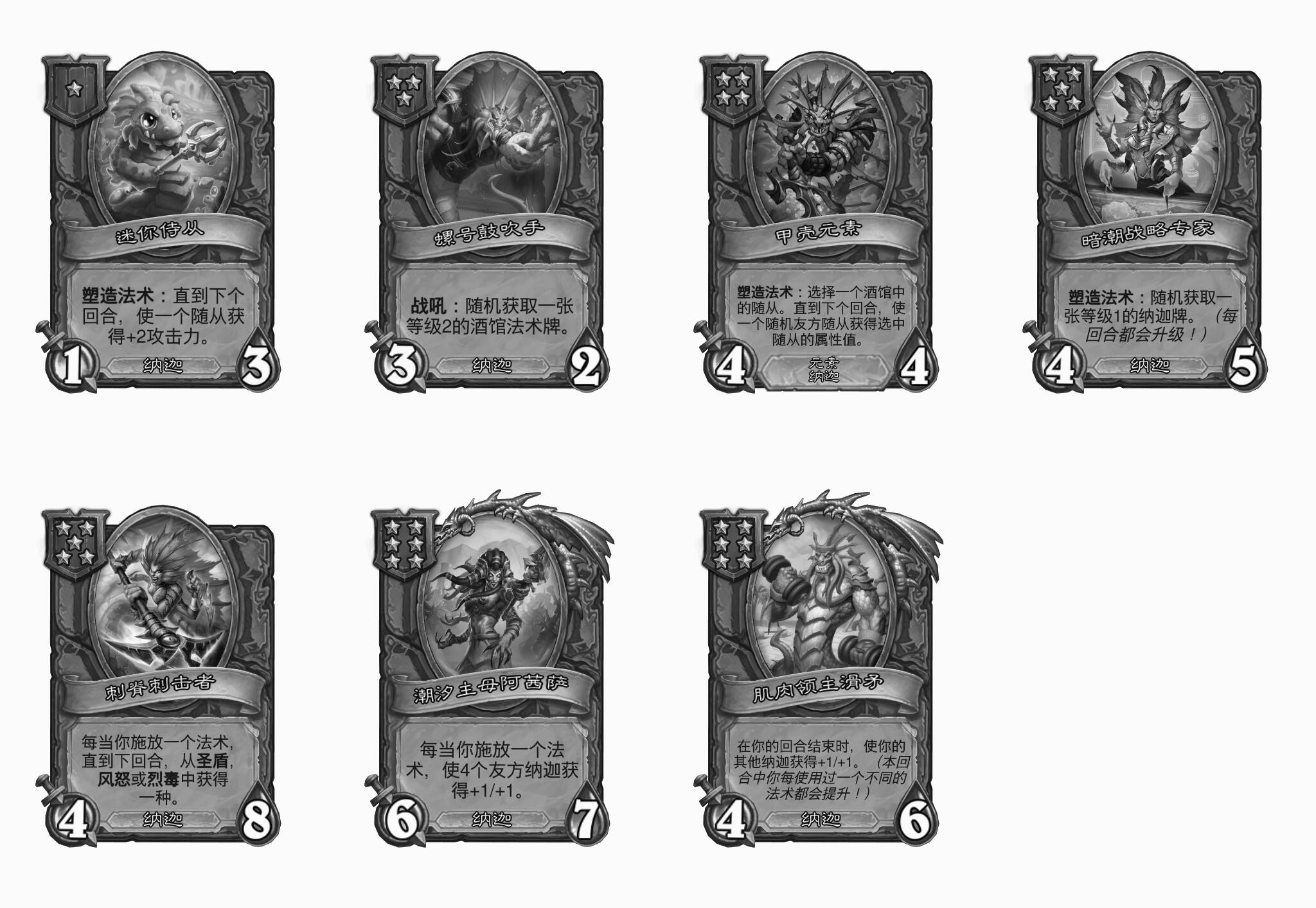 - [4星5/6纳迦] 塑造法术:你的能使随从获得属性值的酒馆法术在本局对战中额外获得+1攻击力。