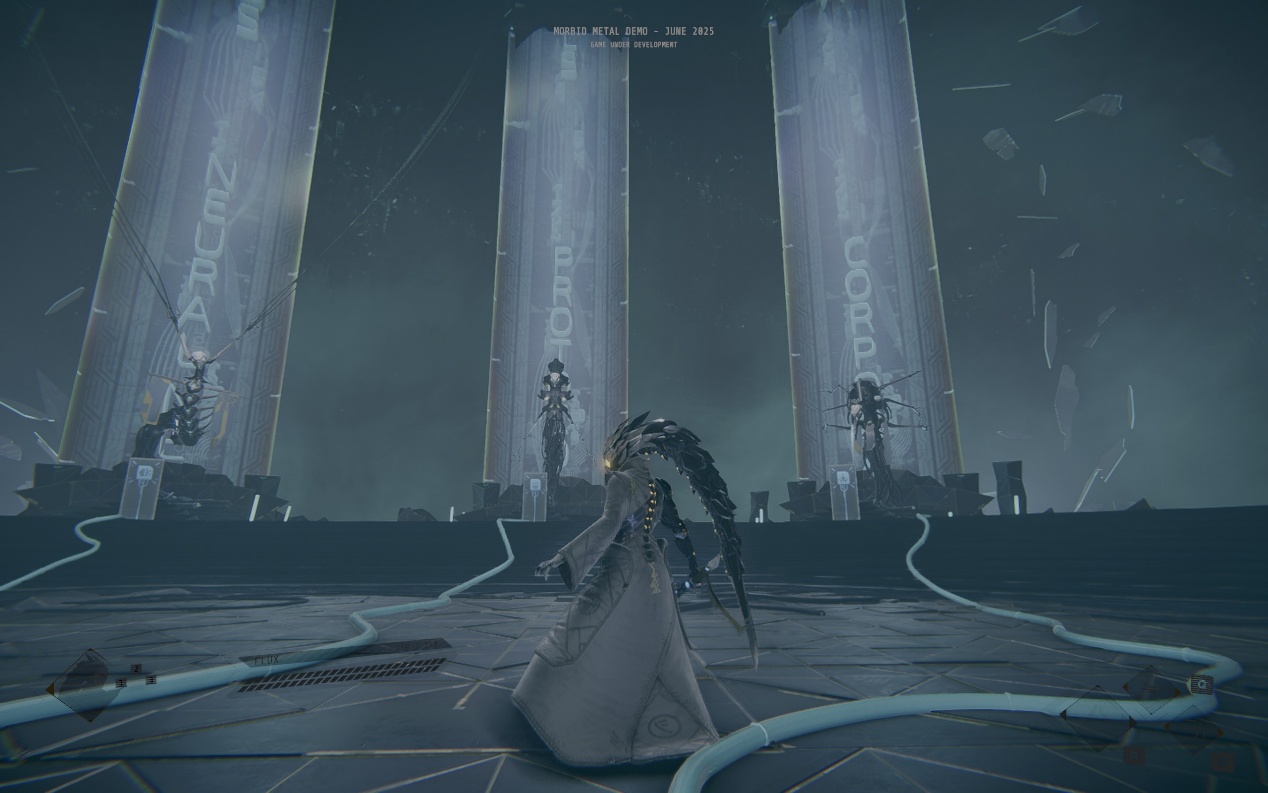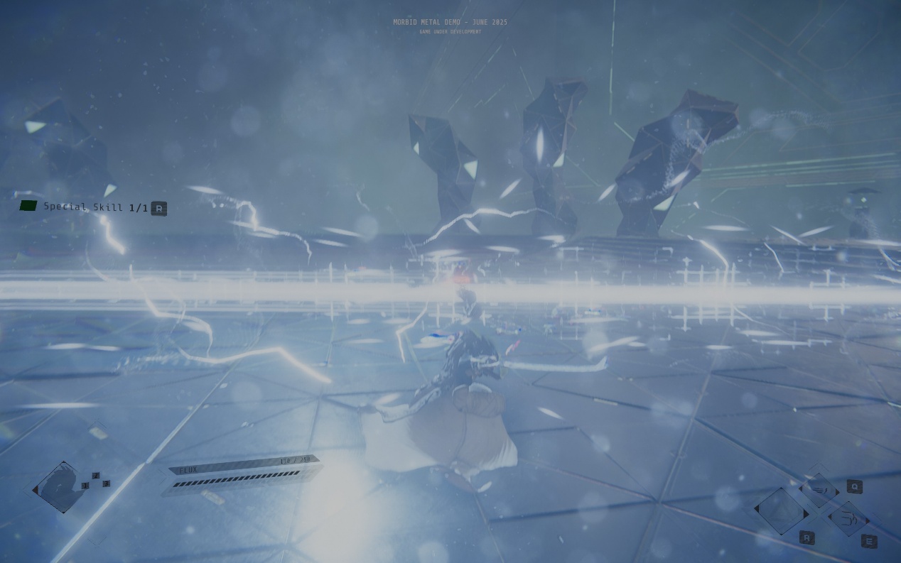 首先快速给Demo定个性,白璧有瑕。目前试玩版本开放了两名风格不同的角色,1个关卡,并展示了局外养成的环境(未开放)。作为一款快节奏的3D动作肉鸽游戏,本作在动作设计、机甲设计以及围绕着快速战斗设计的一系列视觉反馈上特色鲜明,表现力突出。然而同样是视觉方面,在交互界面的设计上则突出一个科技风拉满——然后和同样科幻的背景融为一体,成了细节破坏游戏性的典范。而战斗设计上,角色之间的差异性非常明显,且可以在局内随时切换,构成了丰富且华丽的战斗设计。然而同样是战斗方面,多个角色的buff在局内关卡上混池刷新,使得有限流程中玩家的构筑变得非常困难。流程方面,游戏进一步开发了3D游戏在地图设计上的优势,并引入了一套跑酷系统代替了肉鸽游戏中常用的地图切换系统,将整个战局变得更加连贯,与战斗节奏更加适配。然而同样是地图设计,游戏也引入了与线性探索相悖的各种隐藏空间,并且将消耗品和回复工具藏在(甚至是战斗区间之外的)地图角落,打断了探索的整体节奏。总之,本作在各个系统上都有着独特和优秀的表现,但是每一部分,也都有着同等的弊端,令人扼腕,期待正式版打磨后的效果。