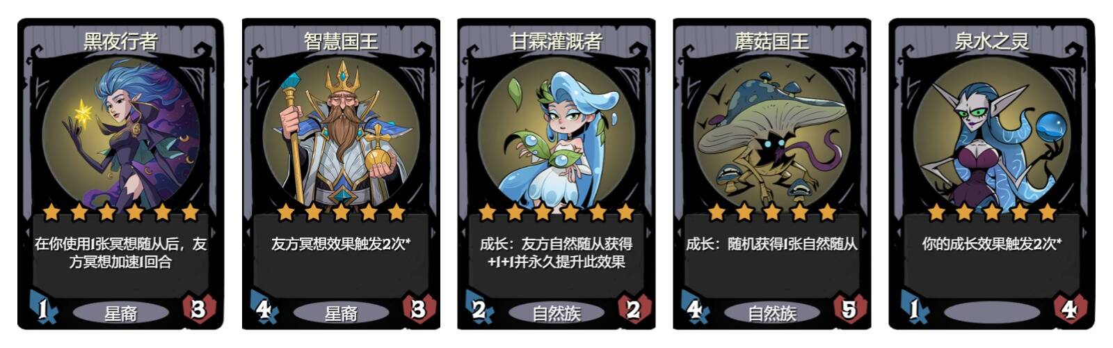在转型期间,我们要凑齐黑夜行者、智慧国王、泉水之灵和蘑菇国王的阵容(甘霖灌溉者可以通过蘑菇国王获取,但要升到六本),然后通过沐恩树灵来提升经济和身材发育速度,在转型前期阵容如下图所示。