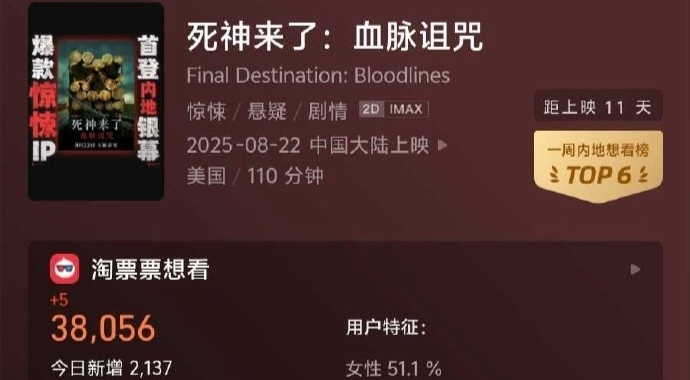这个决定并不意外——《死神来了6》在今年5月上映后大获成功,全球票房超过2.86亿美元,其中北美贡献了1.381亿美元。这是系列第六部电影,也是自2011年以来的首部新作。它不仅让系列复活,还刷新了纪录:北美票房几乎是2009年《死神来了4》的两倍。