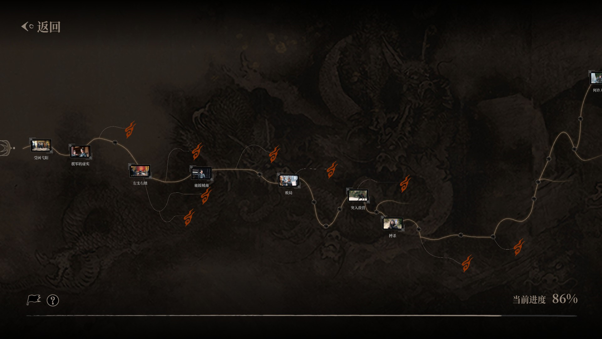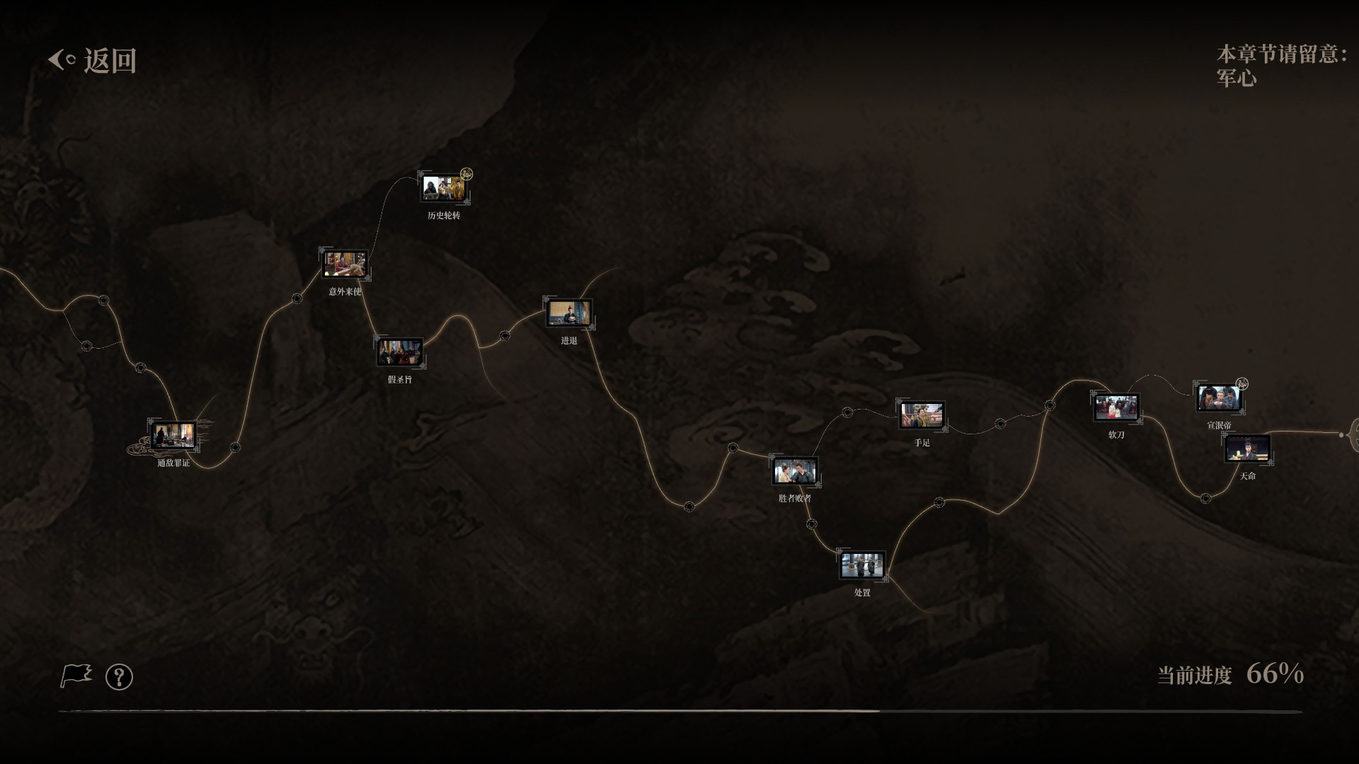 在随后的章节中,展现了王师北伐的艰苦卓绝,面对北方流民,主角一开始还误以为是敌军探子,准备挥刀相向,但是当流民们拿出自己积攒的少量事物时,主角司空耀潸然泪下,向流民们分发食物的同时,更是下定决心,定要收复北方失地。但这里只是悲凉情绪的铺垫,当敌方将领石狼以流民为要挟架设蹬城云梯时,玩家不得不射杀流民时,这种悲痛、无奈与自责瞬间涌上心头。好在后面主角经过各种努力,也是击退了石狼,稳住了北方局势。这个过程也是非常的不容易,一旦做错选择就会导致坏结局。中尤其是主角正面单挑石狼的QTE,因其密集程度让笔者重试了多次才通过。这期间10年前的逃兵大刀刘的救赎也是感人泪下。