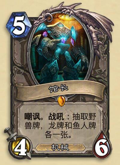 - 旧:嘲讽,战吼:从你的牌库中抽一张野兽牌、龙牌和鱼人牌。