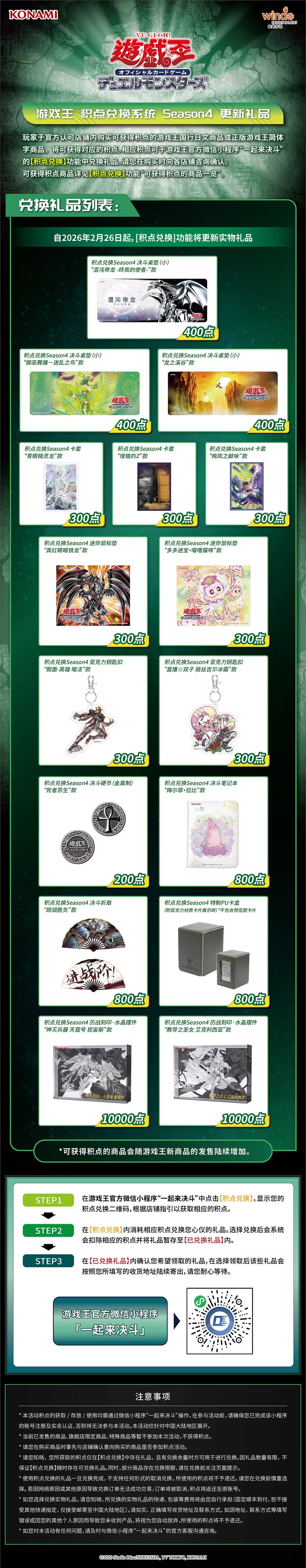 自2026年2月14日起,“一起来决斗”【积点兑换】功能将更新Season4实物礼品。以下礼品将于2月26日15:00开始上架! 玩家于官方认可店铺内购买可获得积点的游戏王国行日文商品或游戏王简体字商品,将可获得对应的积点。相应积点可于游戏王官方微信小程序“一起来决斗”的【积点兑换】功能中兑换礼品。请您在购买时向各店铺咨询确认。 本期积点兑换系统Season4更新的实物礼品最晚将于2026年4月起陆续发货,敬请留意。