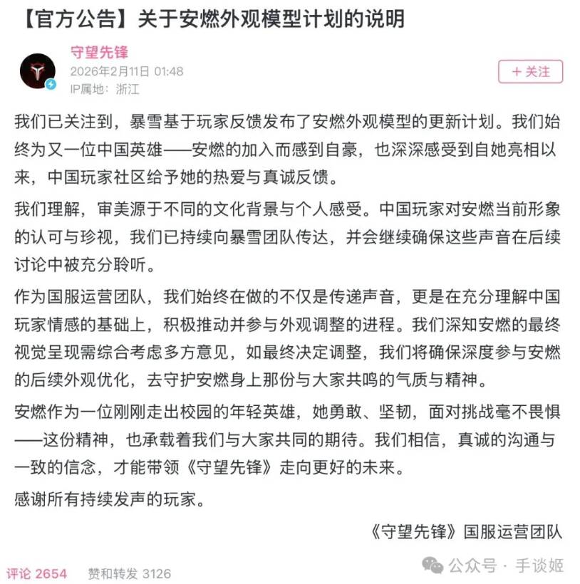 对于修改安燃建模这件事,《守望先锋》中国运营针对目前的情况以及玩家的呼声,也专门发了声明表态,称会传达国内玩家的反馈。
