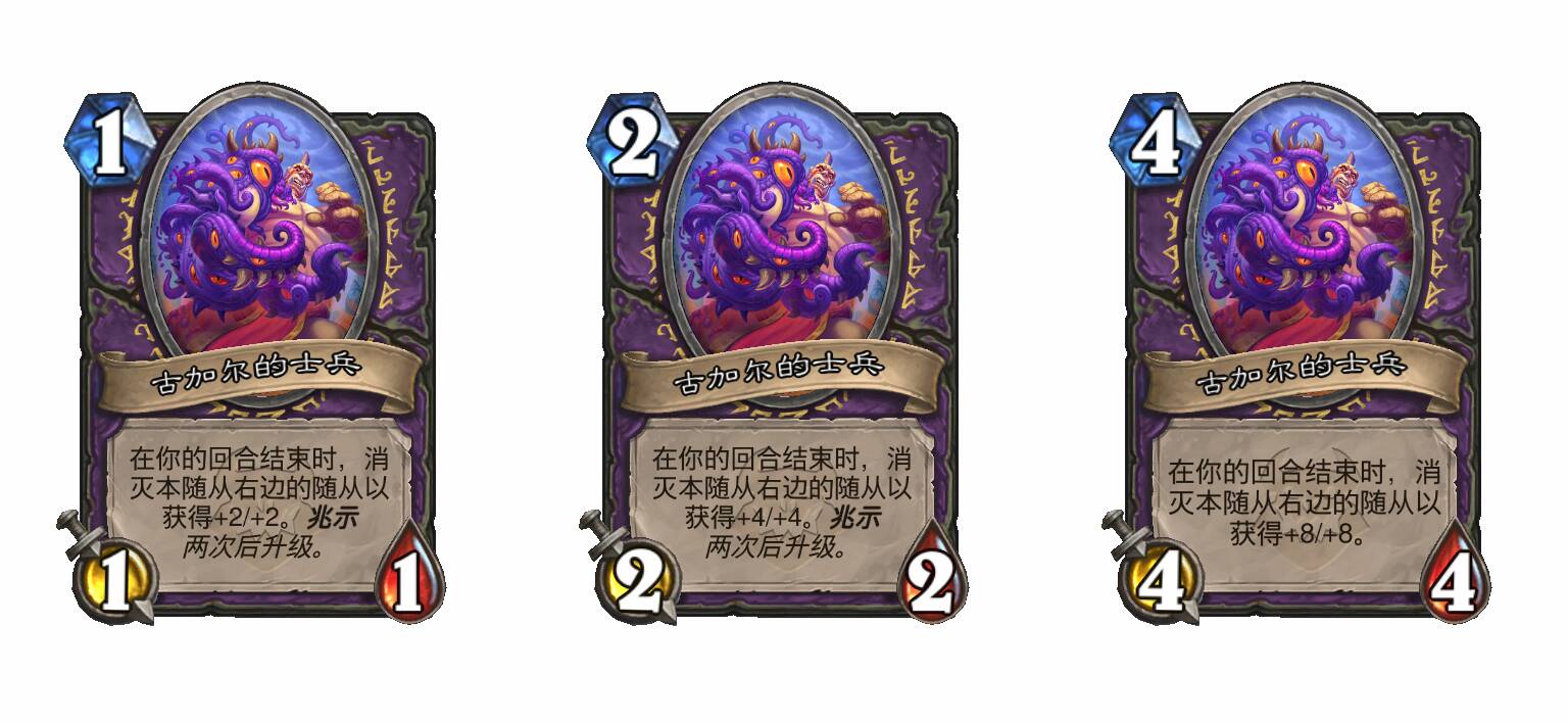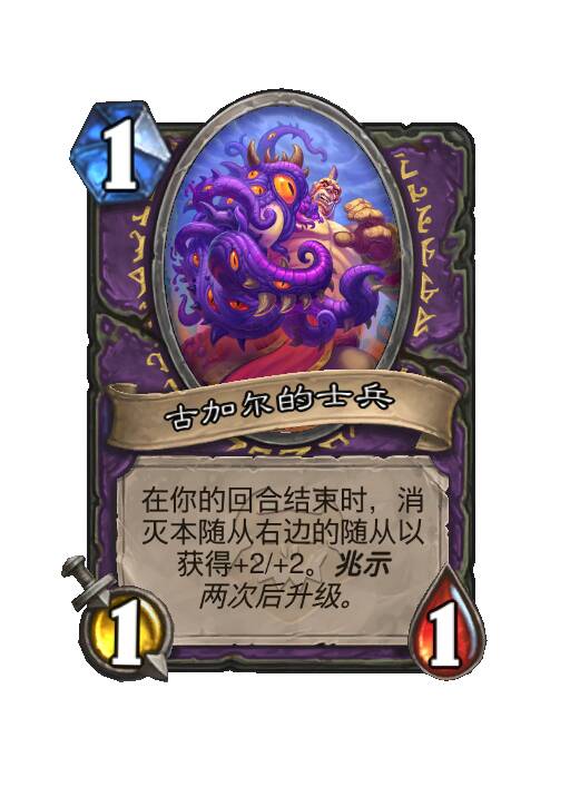 - 使用2次后兆示衍生物/兆示巨型附属物升级(身材效果翻倍),兆示英雄牌死亡之翼战吼效果升级(次数翻倍);再使用2次后再升级(再翻倍)