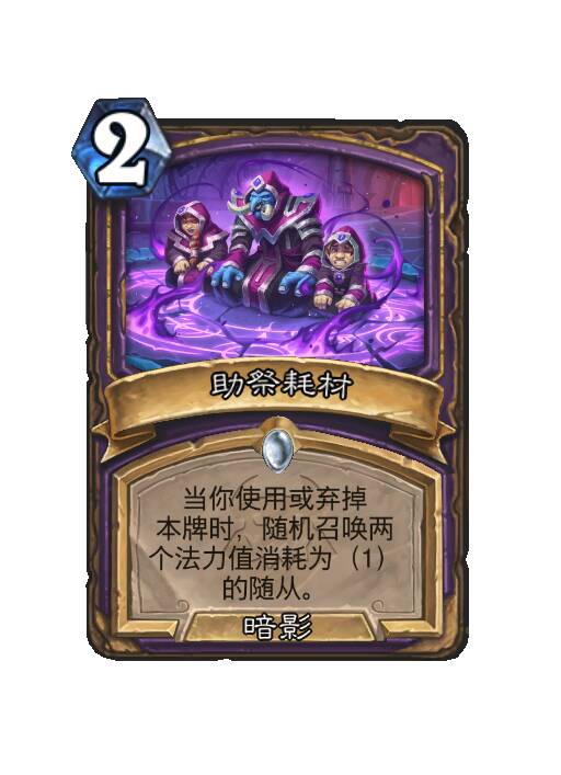 当你使用或弃掉本牌时,随机召唤两个法力值消耗为(1)的随从。