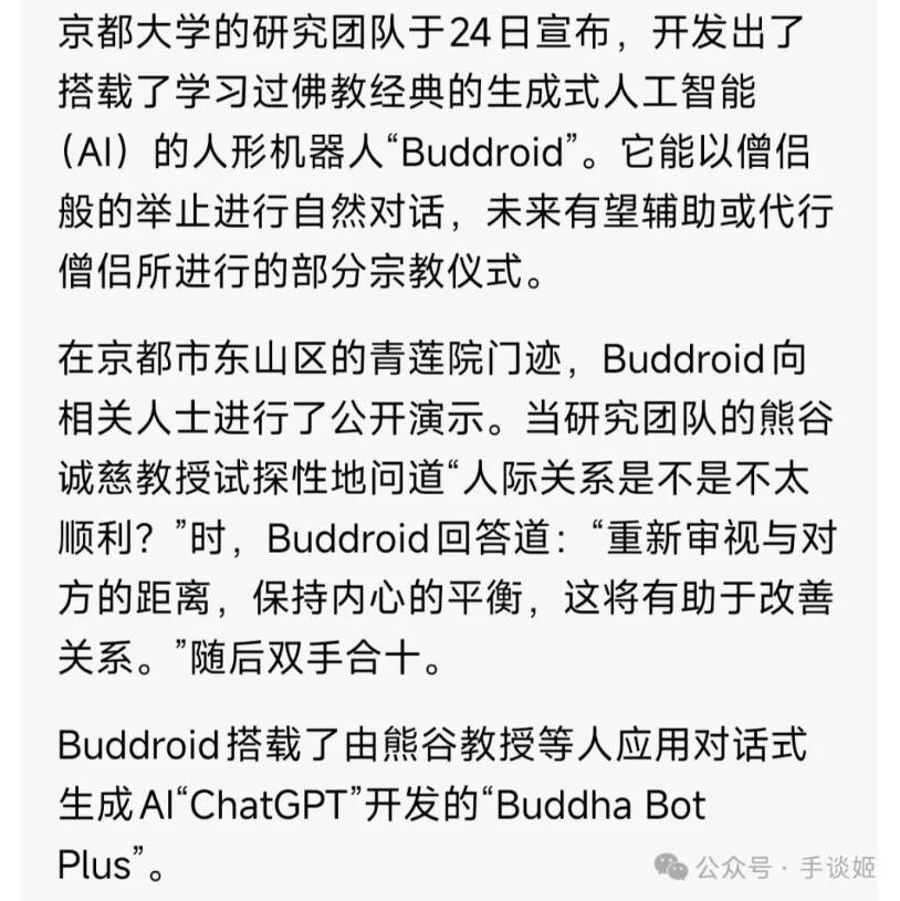 就像大家曾经在各种作品里读到、看到的那样,真有人在给AI投喂了大量经文数据之后,把搭载了AI的机器人折腾成赛博高僧的样子,甚至被给予代替人类举办宗教仪式的厚望。