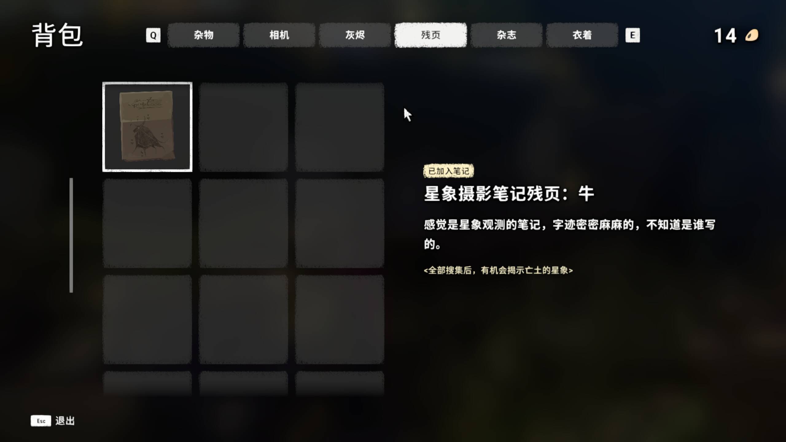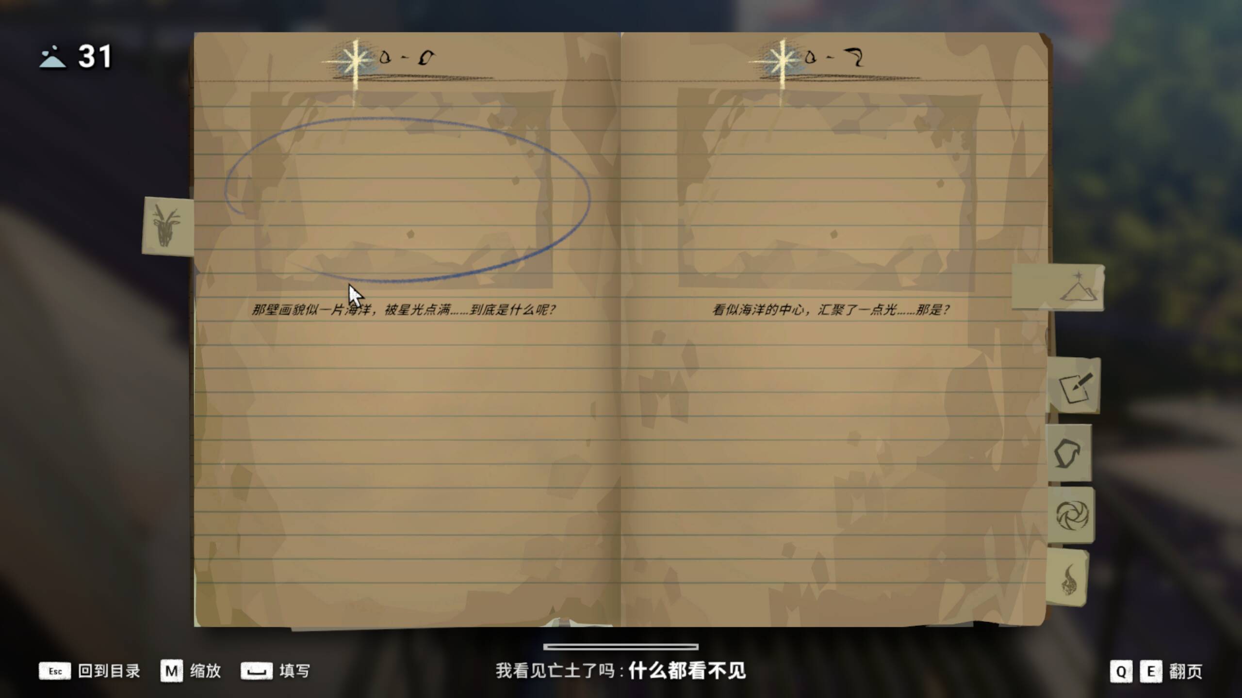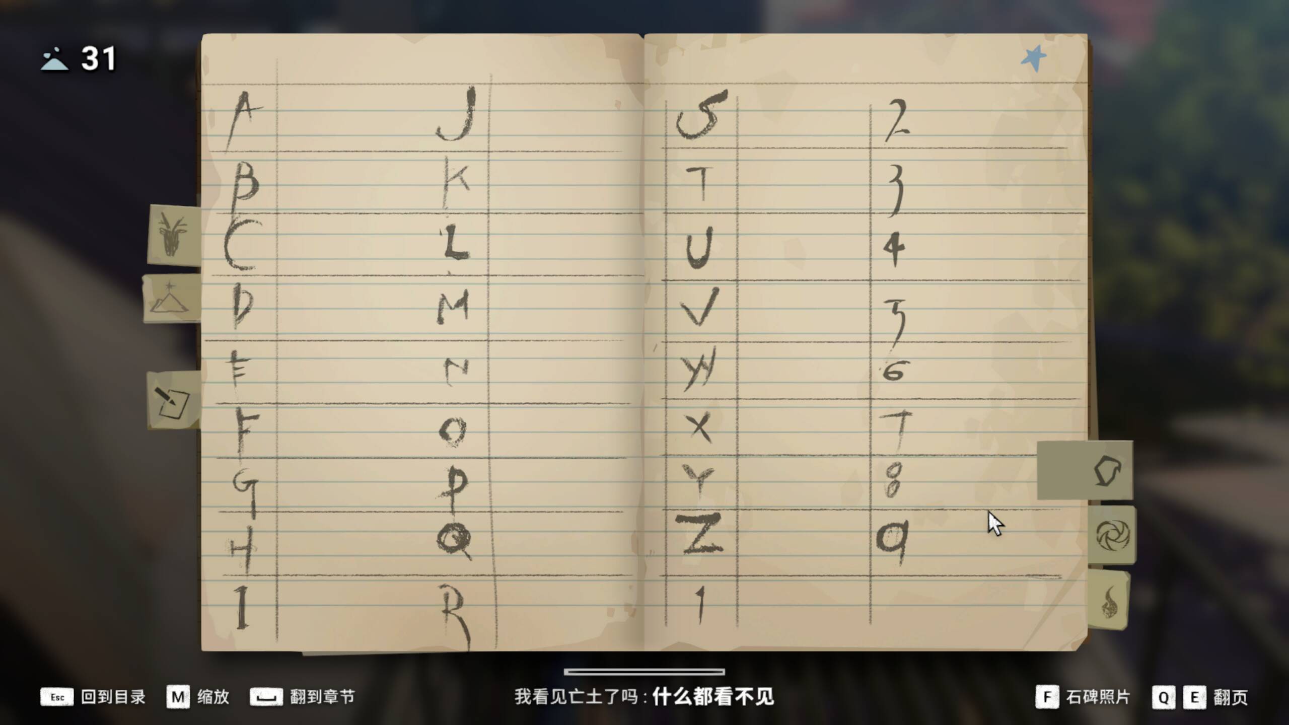 游戏的收集要素有4个,全都需要在游戏中通过相机来拍照获得,而一部分收集要素也是通往星象结局的钥匙。三个要素分为“星象图”、”亡土的历史”、“摄影杂志”与“神文的解读”,“星象图”和“摄影杂志”是必须要通过不同的照片收集或组合来获取的,而“亡土的历史”则是直接在游戏中拍摄壁画来获取,“神文解读”相对更加复杂,需要解读石碑上的密文来添加对应的符号对应的音,在这个收集要素上实际上因为不同的符号比较难记忆,所以导致收集的途中很难找到对应的符号,个人希望如果以后有类似的元素最好可以像生化系列文档那种把抽象的图片转成一个文档来看的方式就更好了。