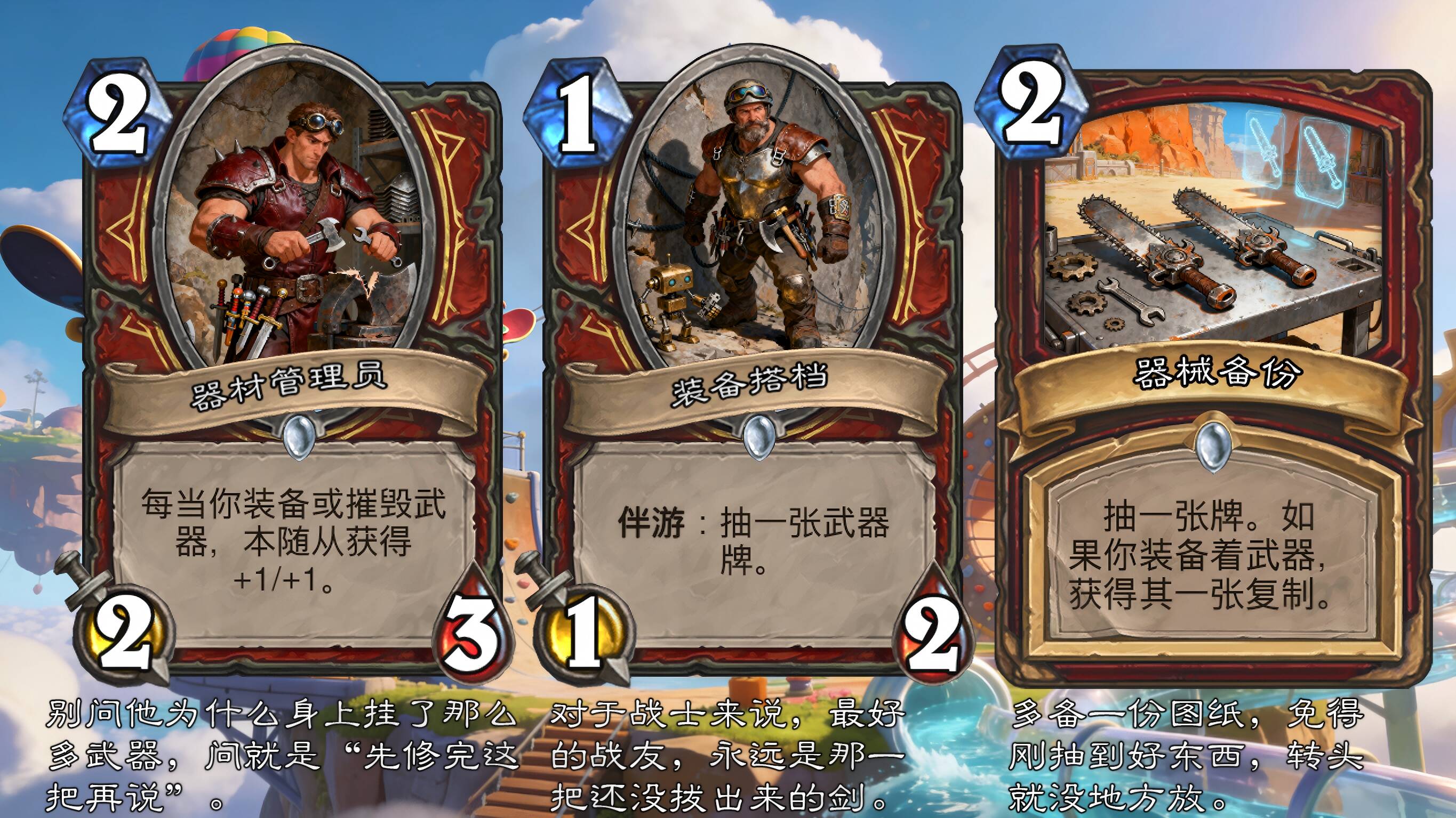 消耗四枚运动币:获得5点护甲值,装备一把2/2的小斧头,召唤两个2/2并具有嘲讽的护栏守卫。