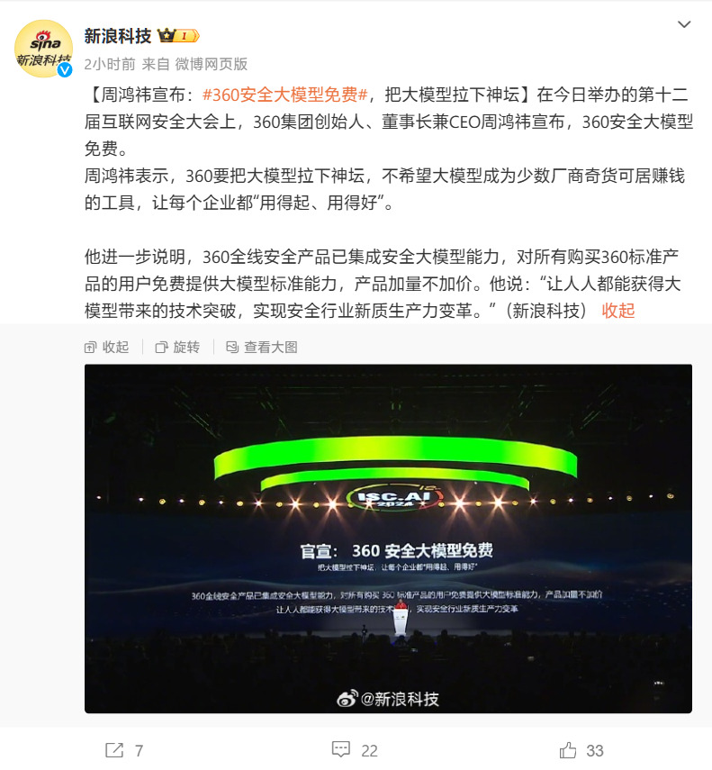 IT之家7月31日消息,据新浪科技,在今天举办的第12届互联网安全大会上,360集团创始人、董事长兼CEO周鸿祎宣布360安全大模型免费。
