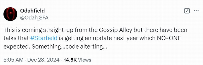 Odah_SFA表示:“有消息称《星空》将在明年进行重大更新,这是所有人没预料到的。还有些......游戏代码将修改。”