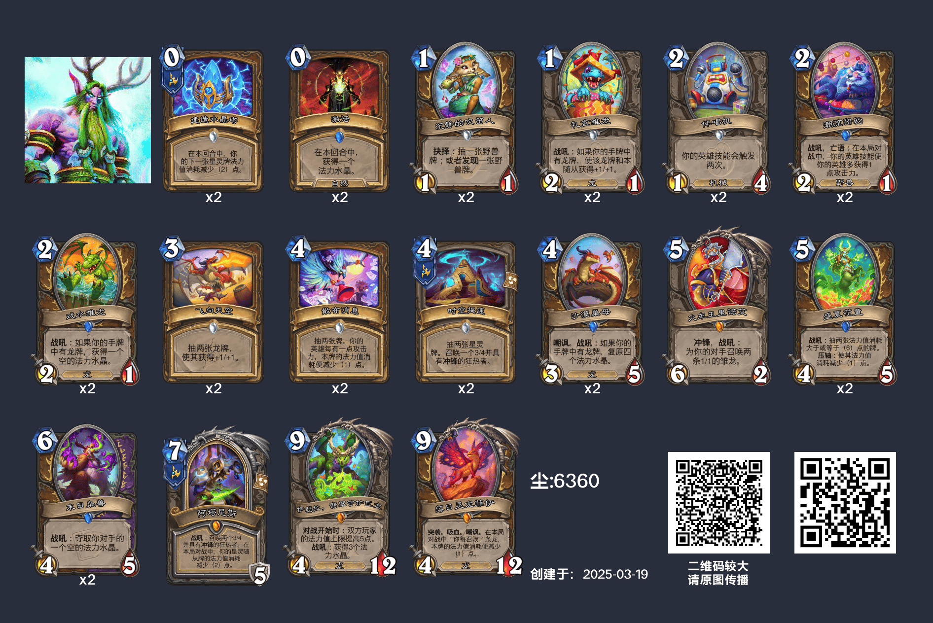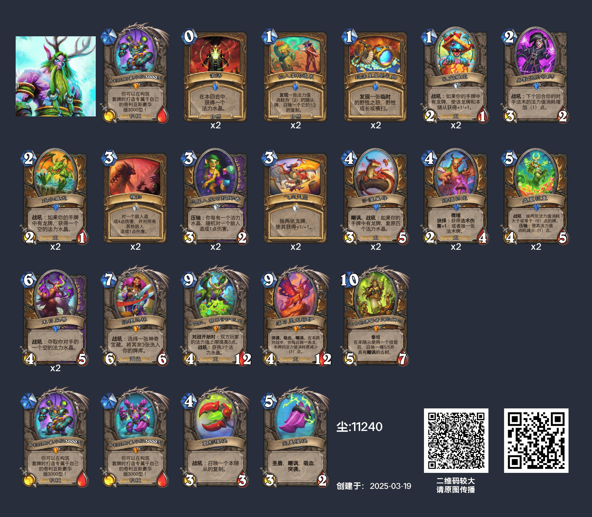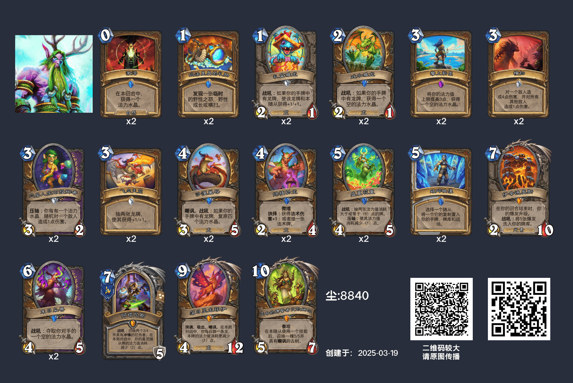 这是一套来自巡回赛冠军maxiebon的爆发龙德,这套卡组在补丁后的一天里迅速走红,成为了大数据全卡组胜率第二,德鲁伊卡组出场率胜率的一的卡组。