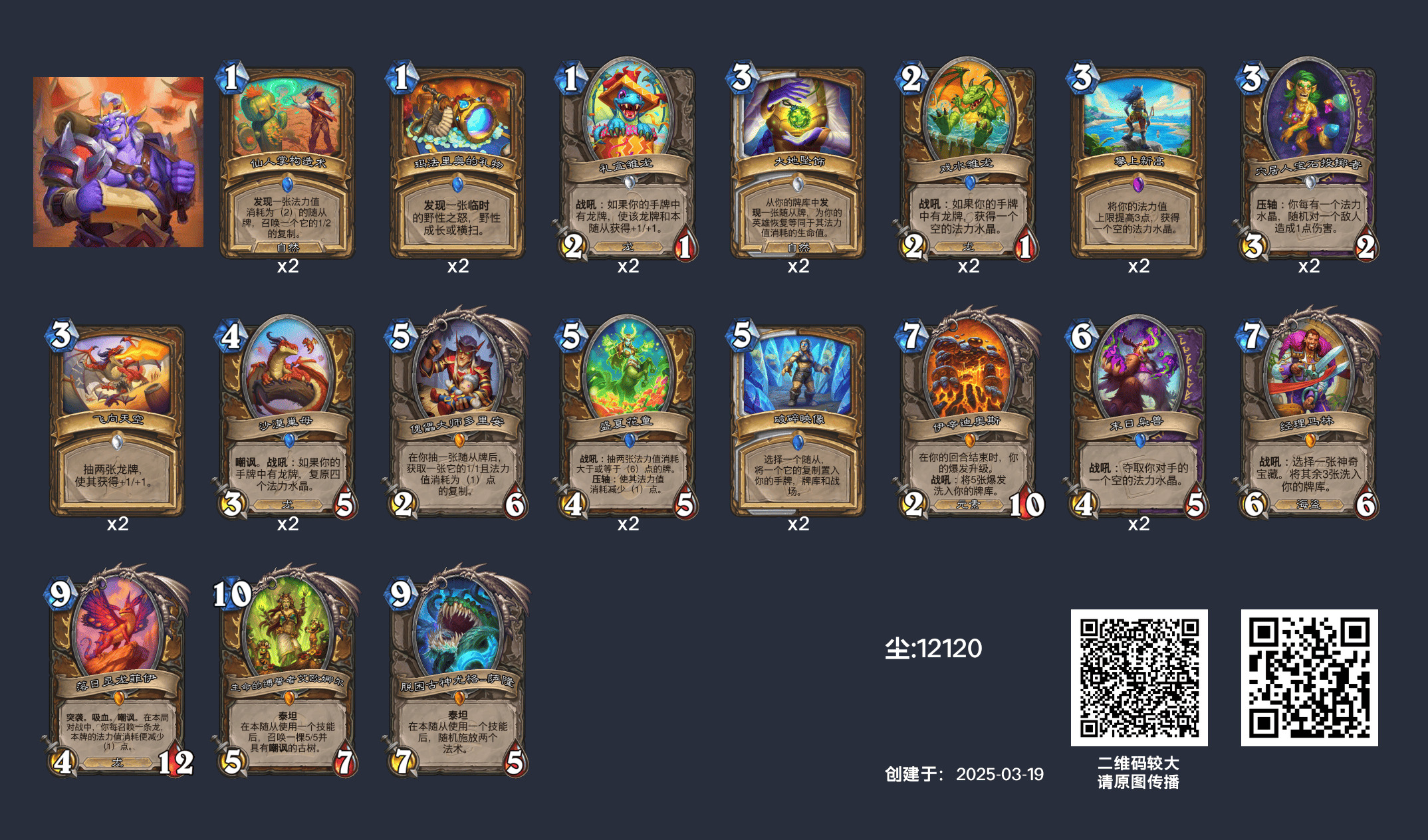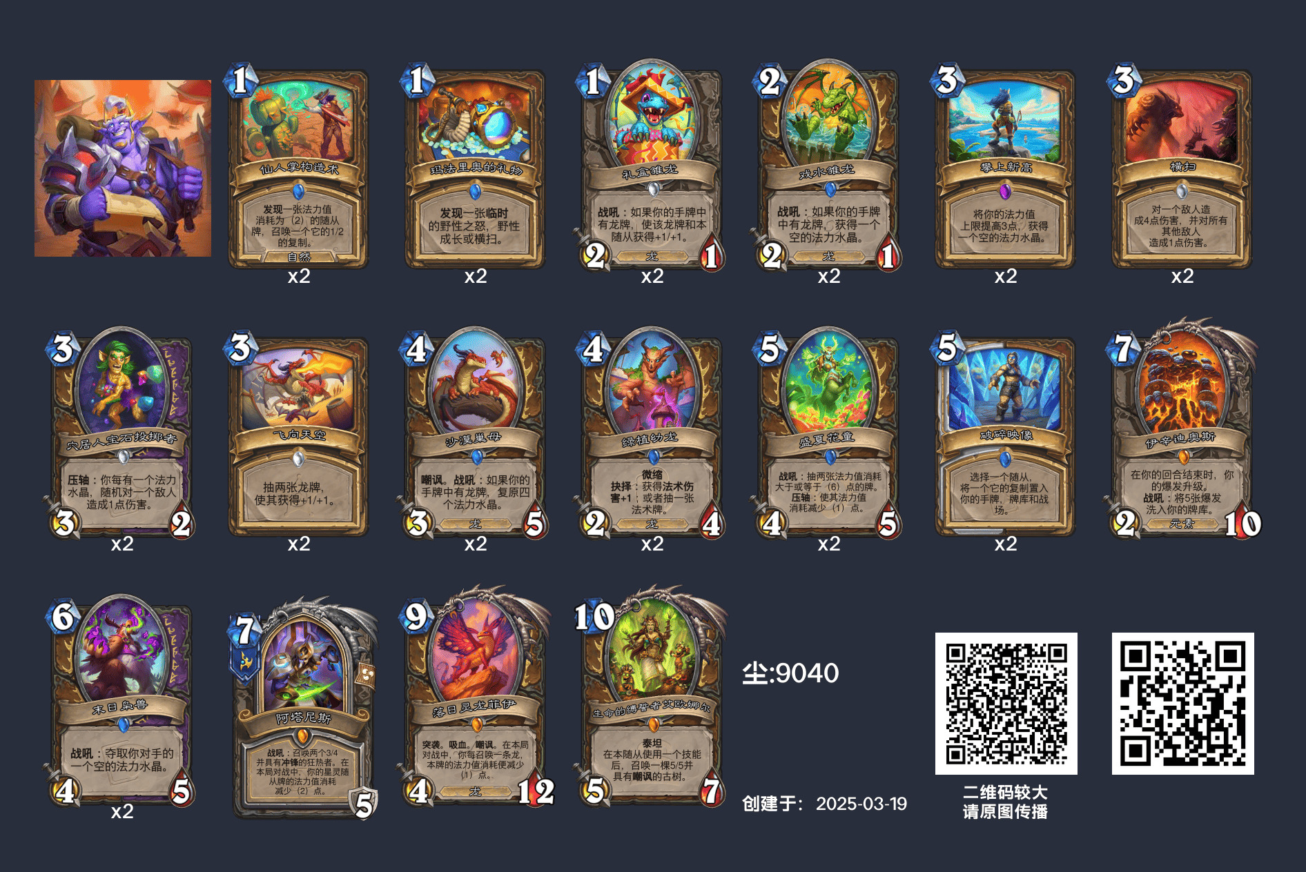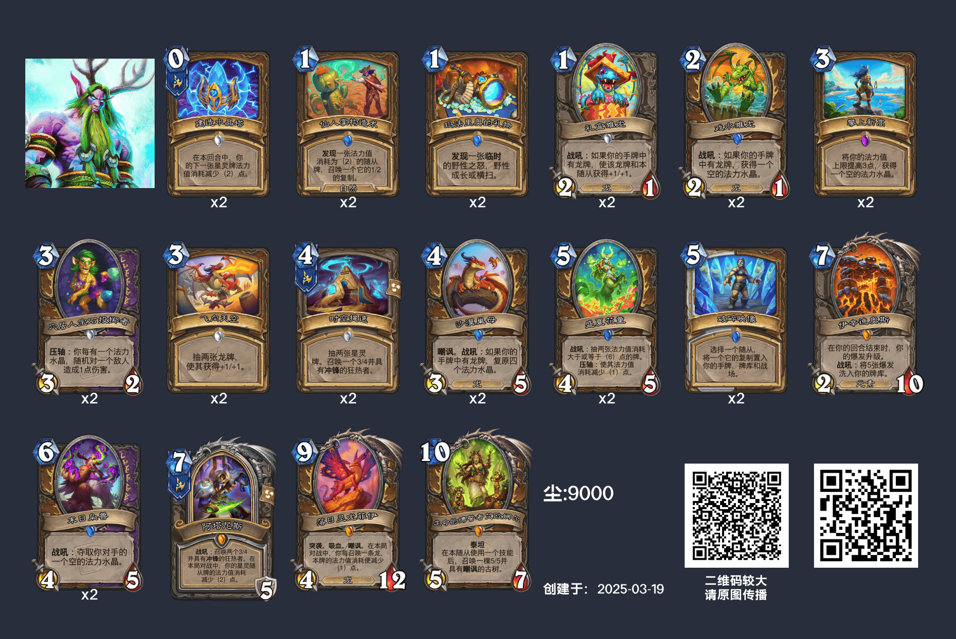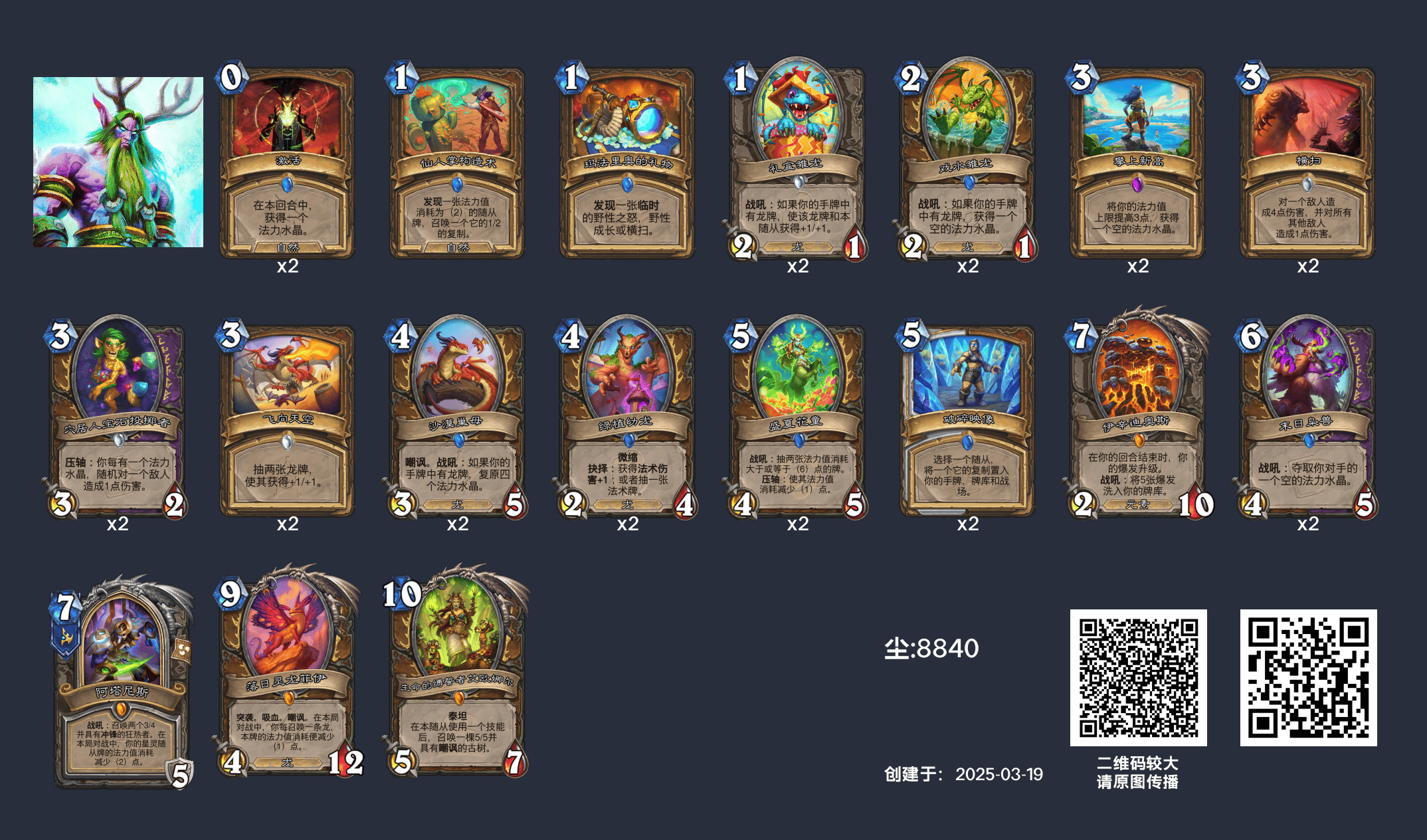 这是一套来自巡回赛冠军maxiebon的爆发龙德,这套卡组在补丁后的一天里迅速走红,成为了大数据全卡组胜率第二,德鲁伊卡组出场率胜率的一的卡组。