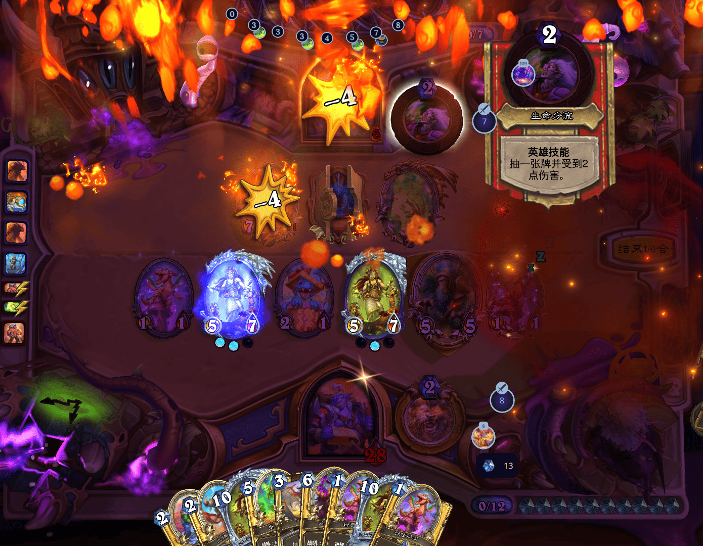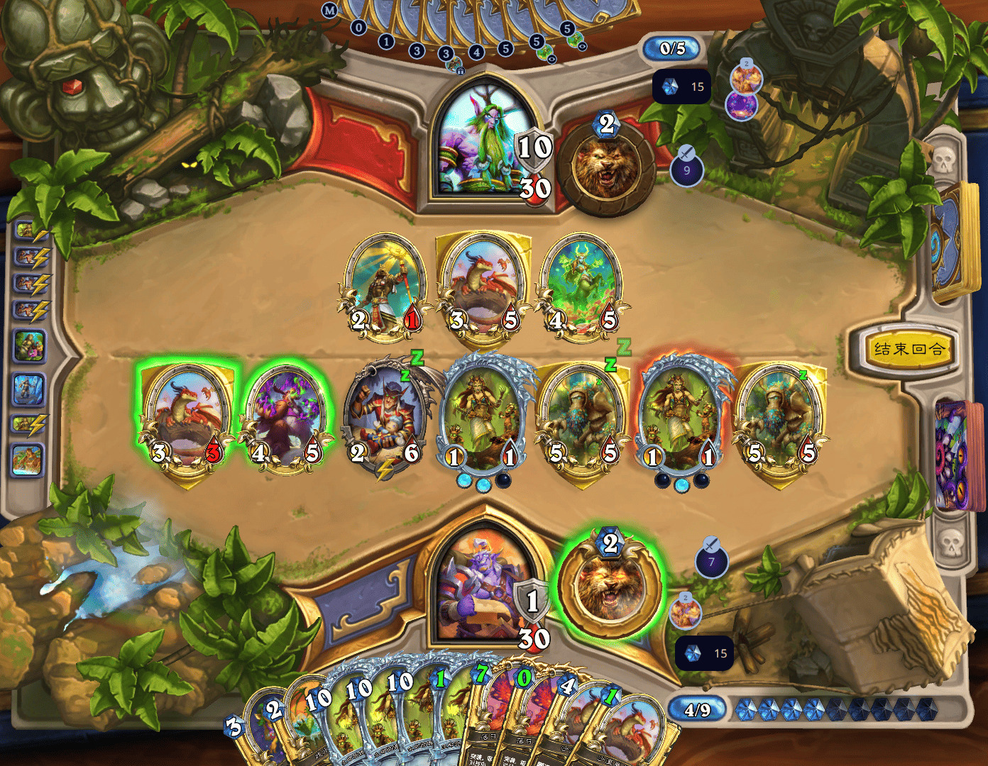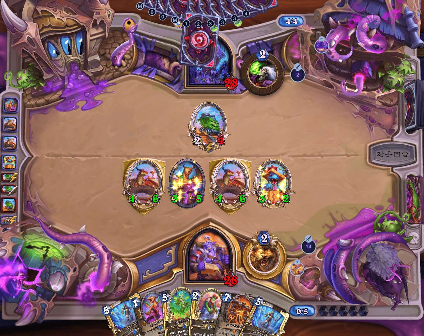 前期小生物赖场非常关键,尽可能多的过牌,多看一张牌往往就有更大的操作空间,在对局中时刻计算手中的伤害额,在被迫交一些法术用于解场时也要算的很清楚,不能交过多的伤害用于解场。