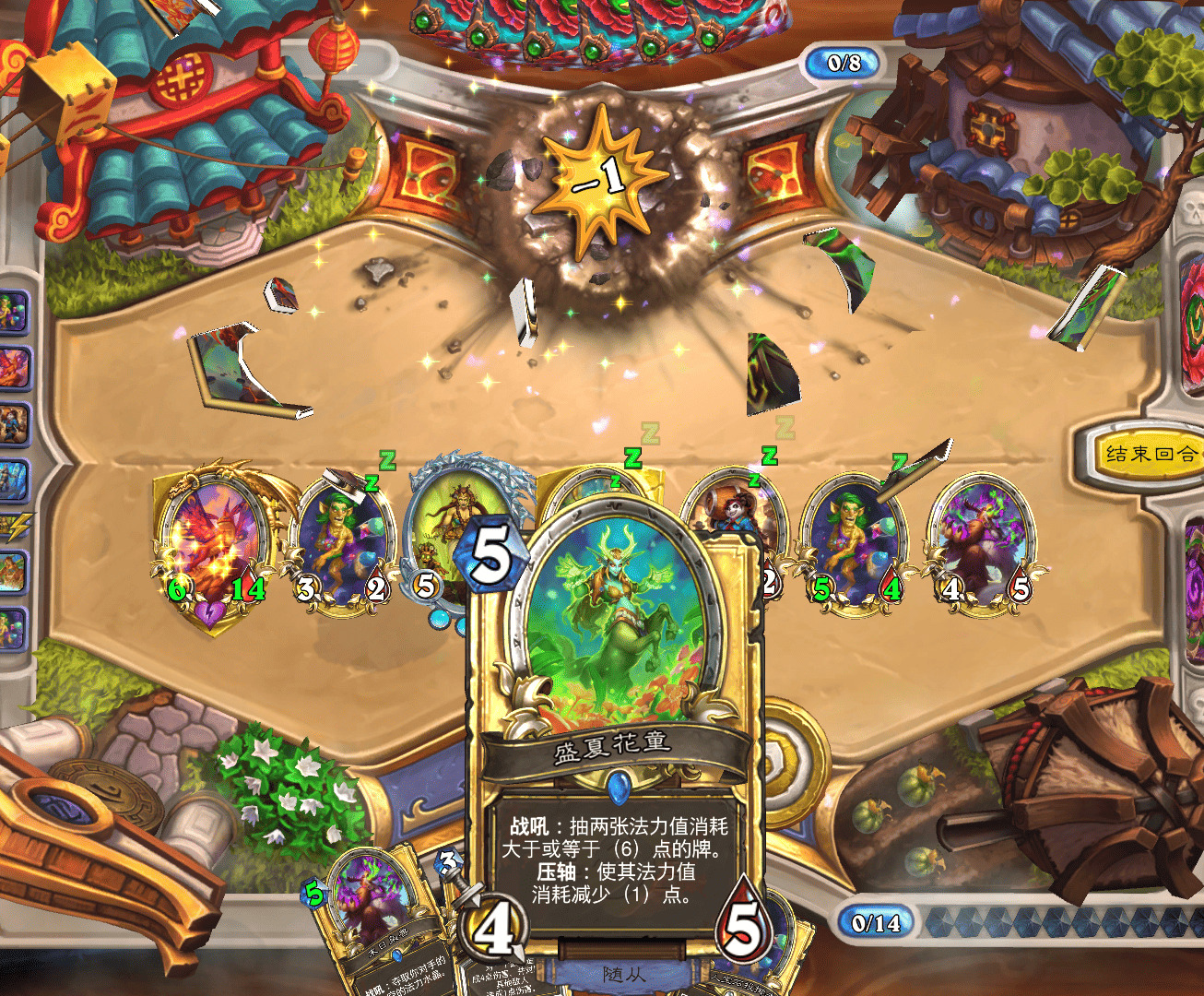 前期优先站场,前四费的节奏很重要,手里有飞向天空或沙漠巢姆的时候就存牌在4费打展开。1、2费可以出仙人掌构造术,礼盒雏龙与戏水雏龙,都是优质的节奏卡,1、2费顺出的情况下就可以留一下硬币来追求上限,比如4费跳盛夏花童,过出5费的末日枭兽基本就能形成费用碾压。