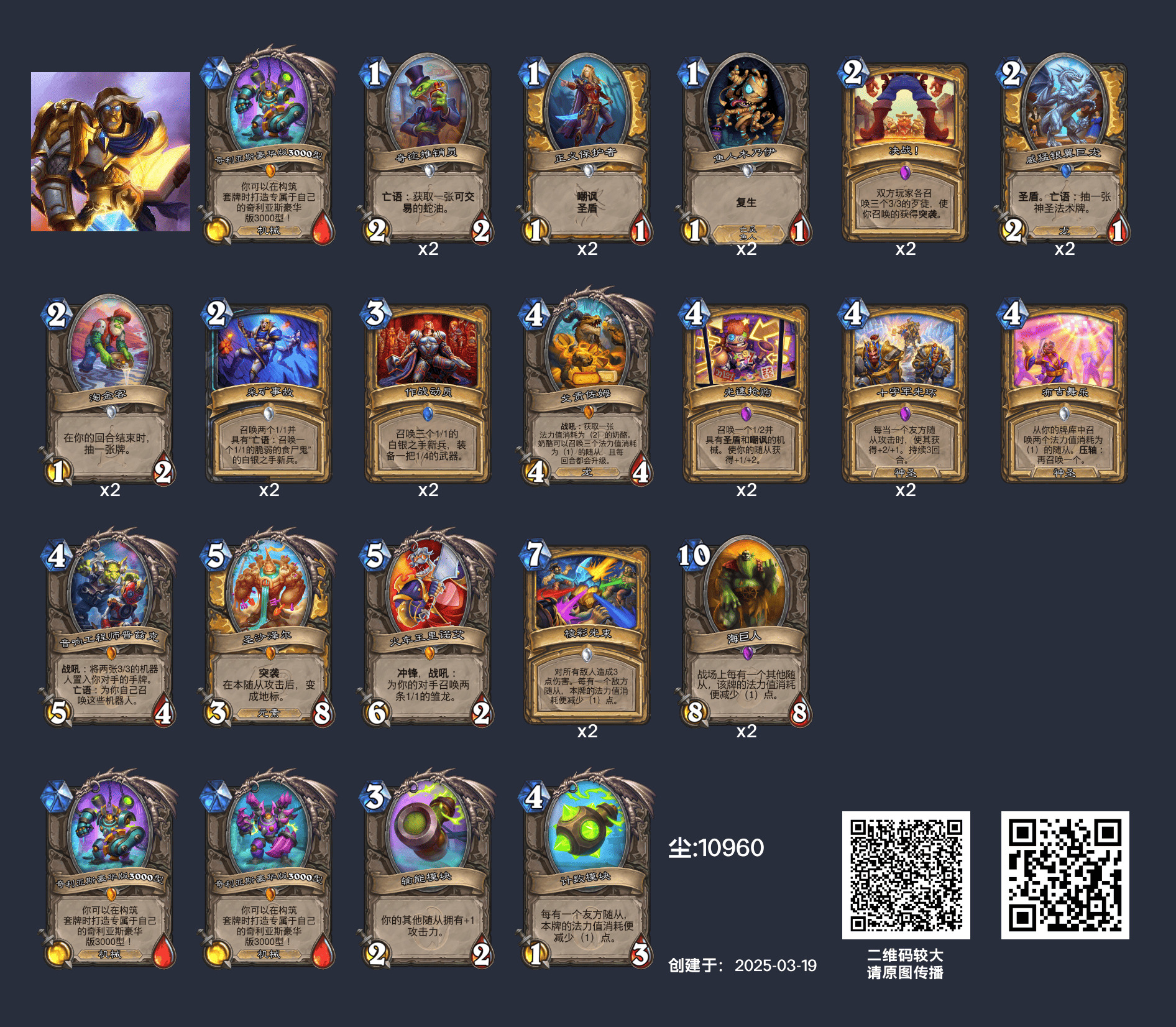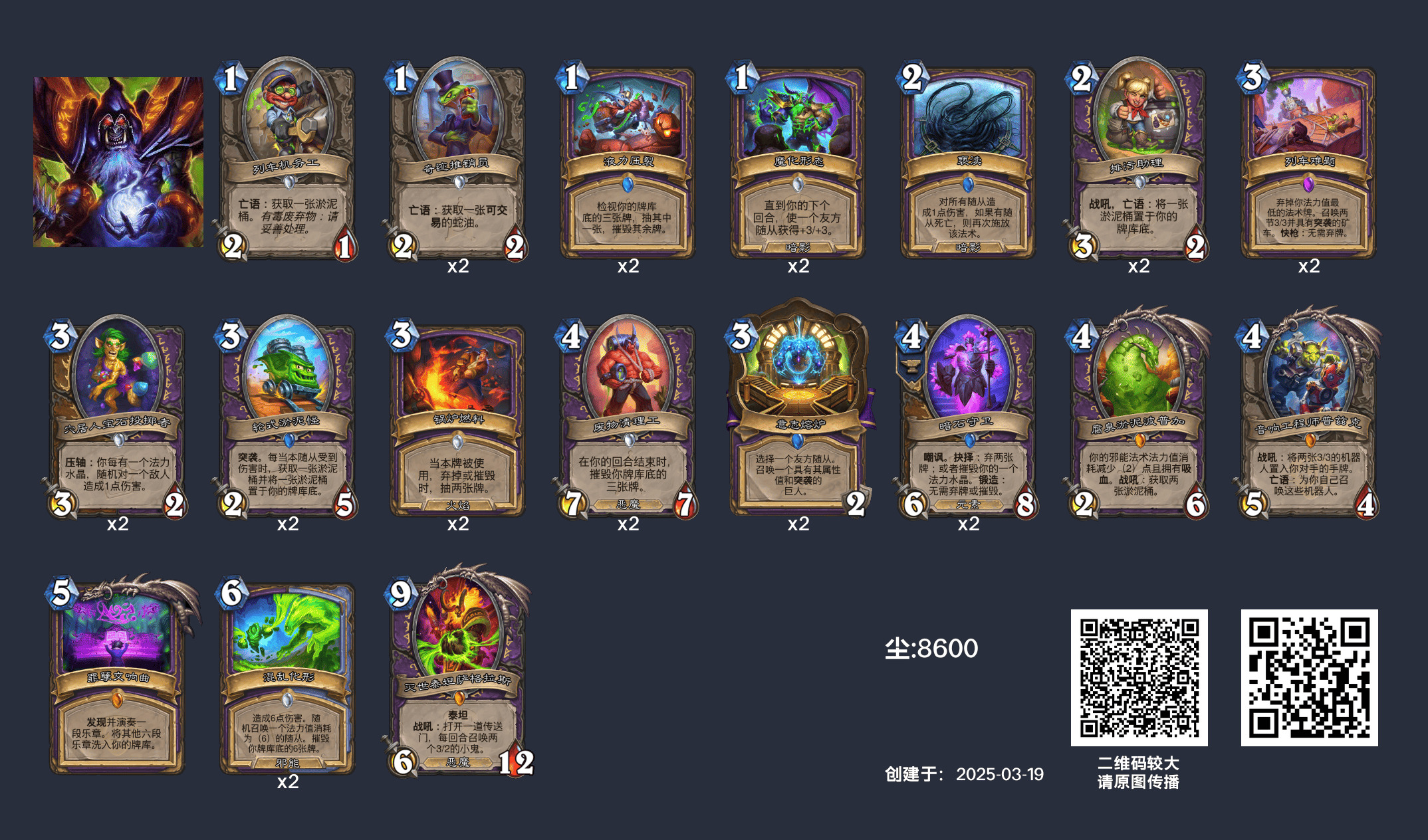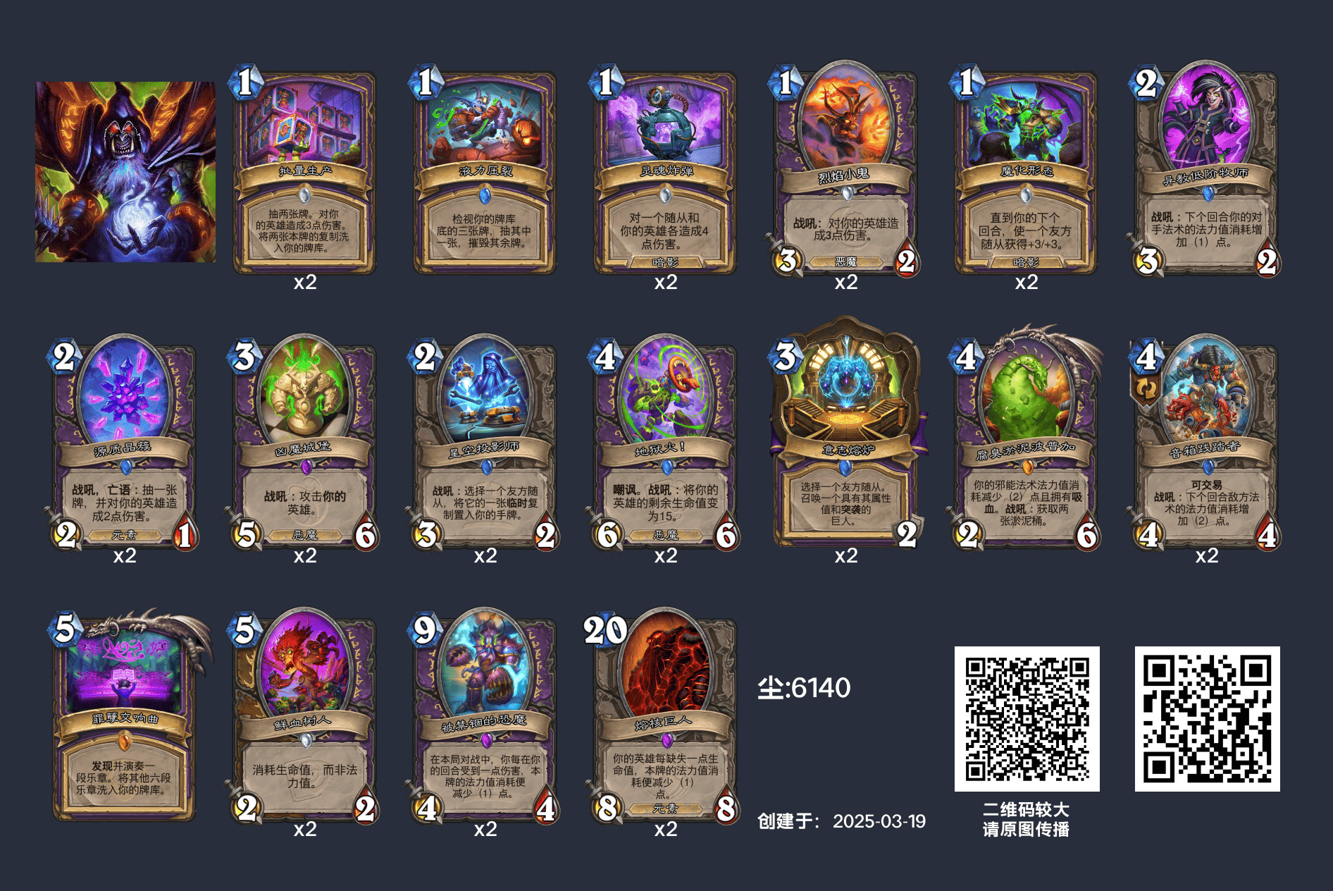 来自大数据前50的一套自残术,自残术的玩法是老一套,但在地标和星空投影师 以及熔核巨人回调后又能玩了。前期通过批量生产、烈焰小鬼、凶魔城堡等牌快速削减自己的血量,然后在4-5费通过地标和星空投影师复制出多个巨人压死场面,同时也可以通过地狱火!、腐臭淤泥波普加等回血。