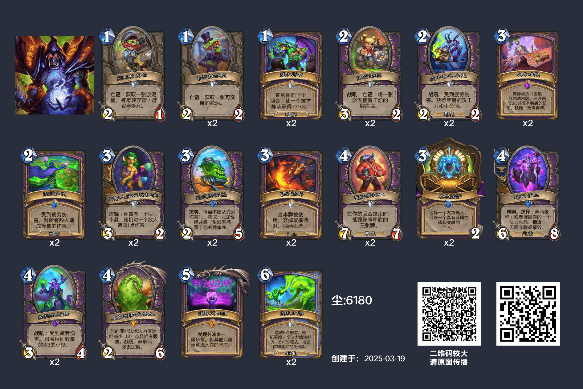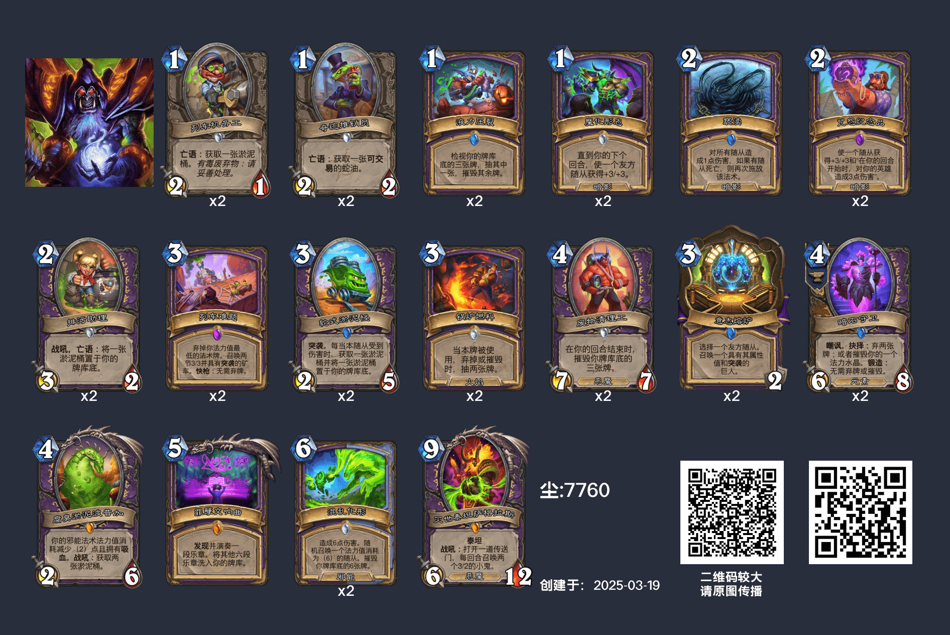 构筑上杂糅了淤泥术和疲劳术,既能靠淤泥术的底子,477配合地标和小力代站上几个大哥哥,也能靠疲劳术的434铺33小杂毛来进行多频率随从交互。还能用淤泥波波配合邪能法术(混乱化形,淤泥桶,渐强声浪)来做到回血和斩杀。