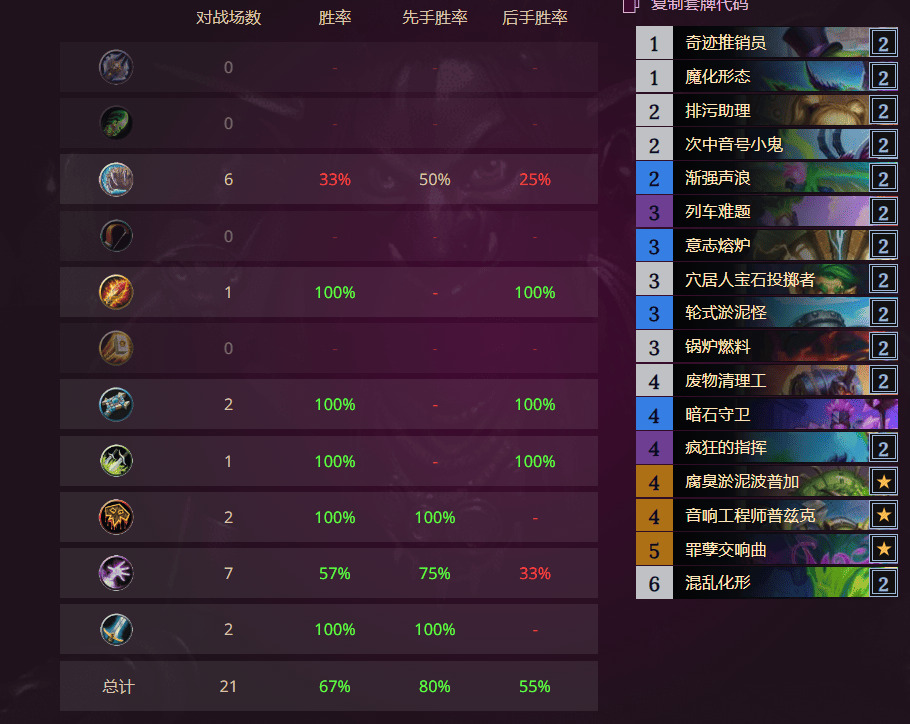 此构筑其实就是古早版本的淤泥疲劳术(笔者是在随缘风直播间抄的),笔者使用这套于补丁后在国服传说分段打出14-7的战绩。