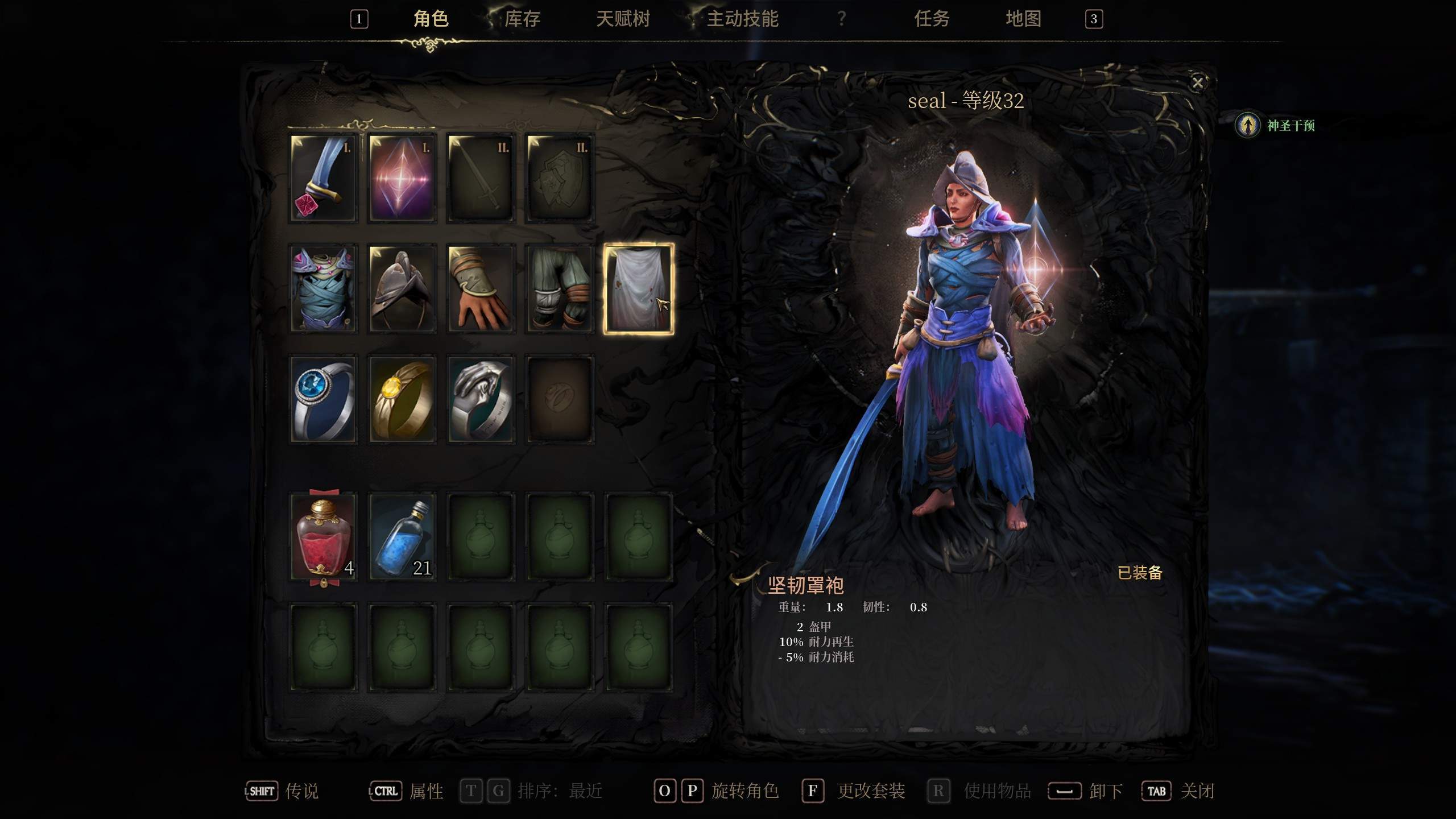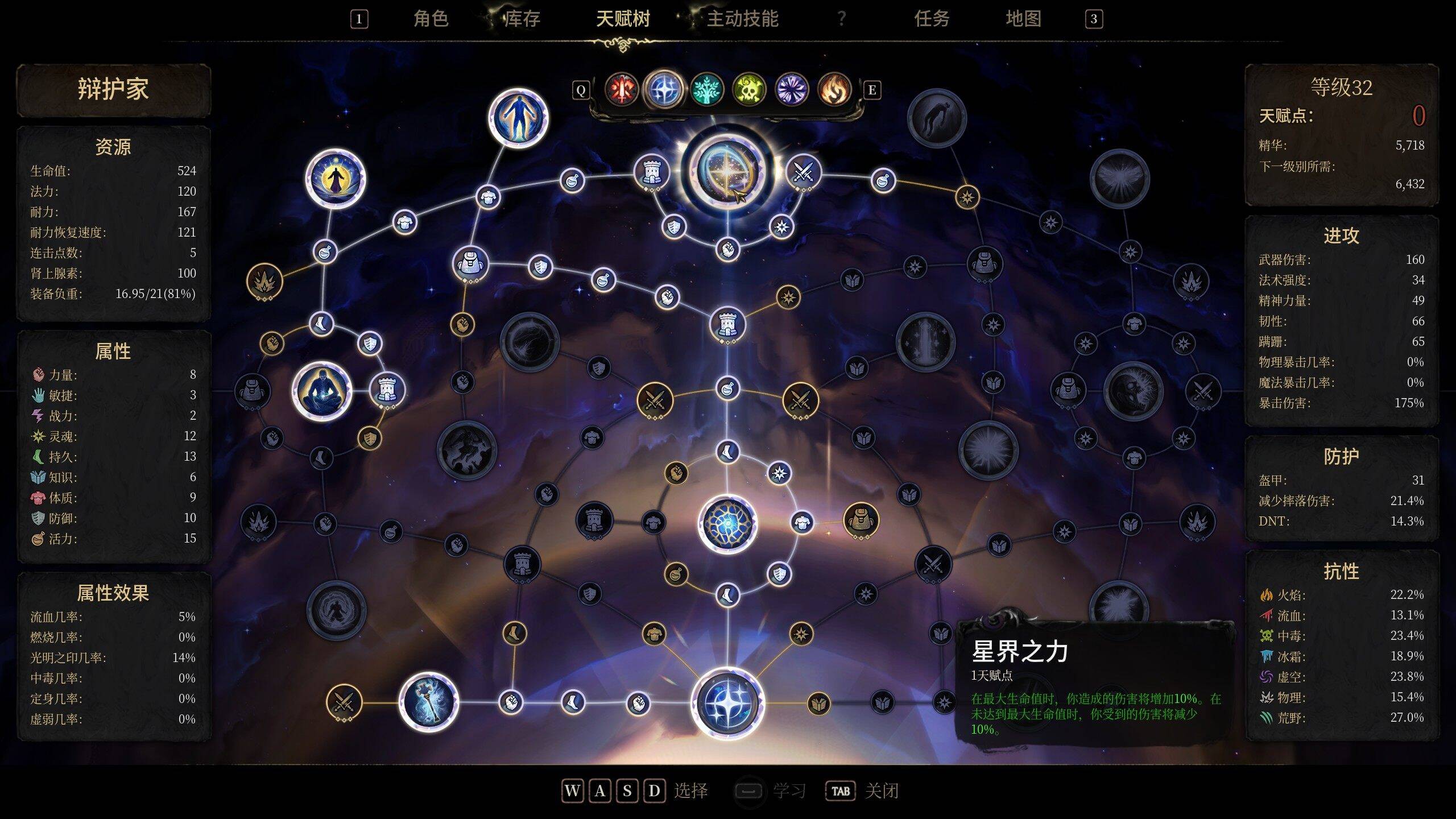 游戏中玩家的基本属性划分比较复杂,除了常用的力量、敏捷、体力等物理侧技能之外,法术侧面根据伤害、魔力条等又划分了战力、灵魂、知识等等(这里吐槽一句汉化hhh)。目前所有职业都是基于一主一附两个属性构建的,同时与技能树左右界面分别公用一个属性,形成了一个临色环。例如笔者主要构筑的辩护家是主耐力辅精神,左右界面的战士和荒野法师就是分别以耐力和精神为辅属性,这也意味着通过打通节点向两侧技能树前进拿到的被动技能对主职业都能部分生效。