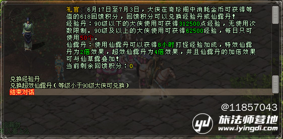 大侠在奇珍阁消耗金币,可获得等额的618回馈积分,使用回馈积分可于【礼官】-【618回馈】处兑换经验丹(永久绑定)、仙露丹(永久绑定)等道具,大侠挂机升级打宝更轻松!