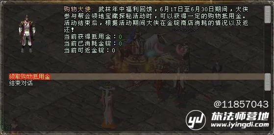 6月17日-6月30日,大侠于金锭商店(包括618狂欢商店)中消耗的金锭数量将被记录,7月1日-7月7日可于临安城-购物大使处领取购物抵用金,最高返17万金锭!请大侠共赴这难得的江湖盛宴!