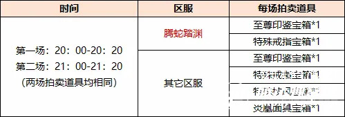 6月18日晚上20:00、21:00将开启2场拍卖活动,至尊印鉴宝箱、特殊戒指宝箱、特殊披风宝箱、炎凰面具宝箱将上架限时拍卖,供豪侠们竞价抢购,价高者得神器,扬名武林!