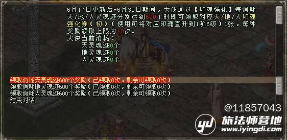 6月17日-6月30日,大侠通过印魂强化功能消耗指定数量的灵魂迹即可到购物大使处领取对应印魂直升券!大侠印魂强化快人一档,笑傲群侠!