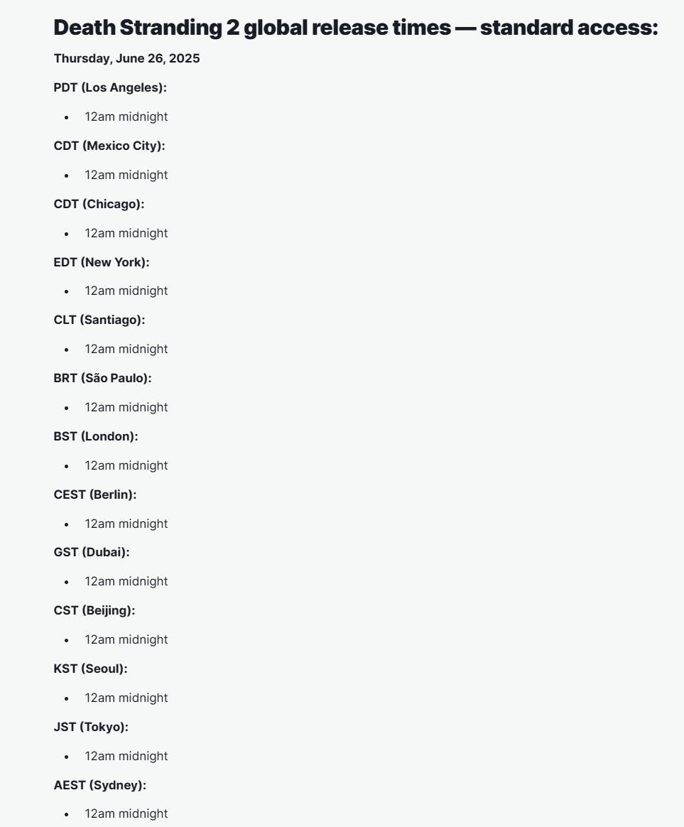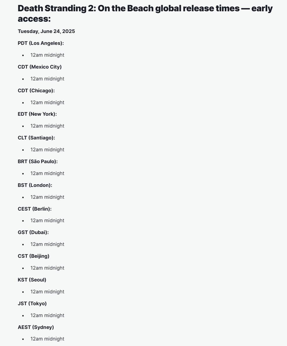 Kojima Productions发布了《死亡搁浅2》游戏在全球各地的解锁时间表,不过预购豪华版的玩家可在6月24日提前两天进入游戏。