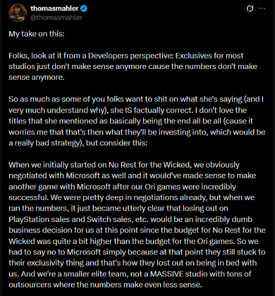 近日,Xbox女总裁Sarah Bond在接受采访时称独占游戏已“过时”的言论引发关注。《奥日》《恶意不息》开发商Moon Studios联合创始人Thomas Mahler对此发表观点: