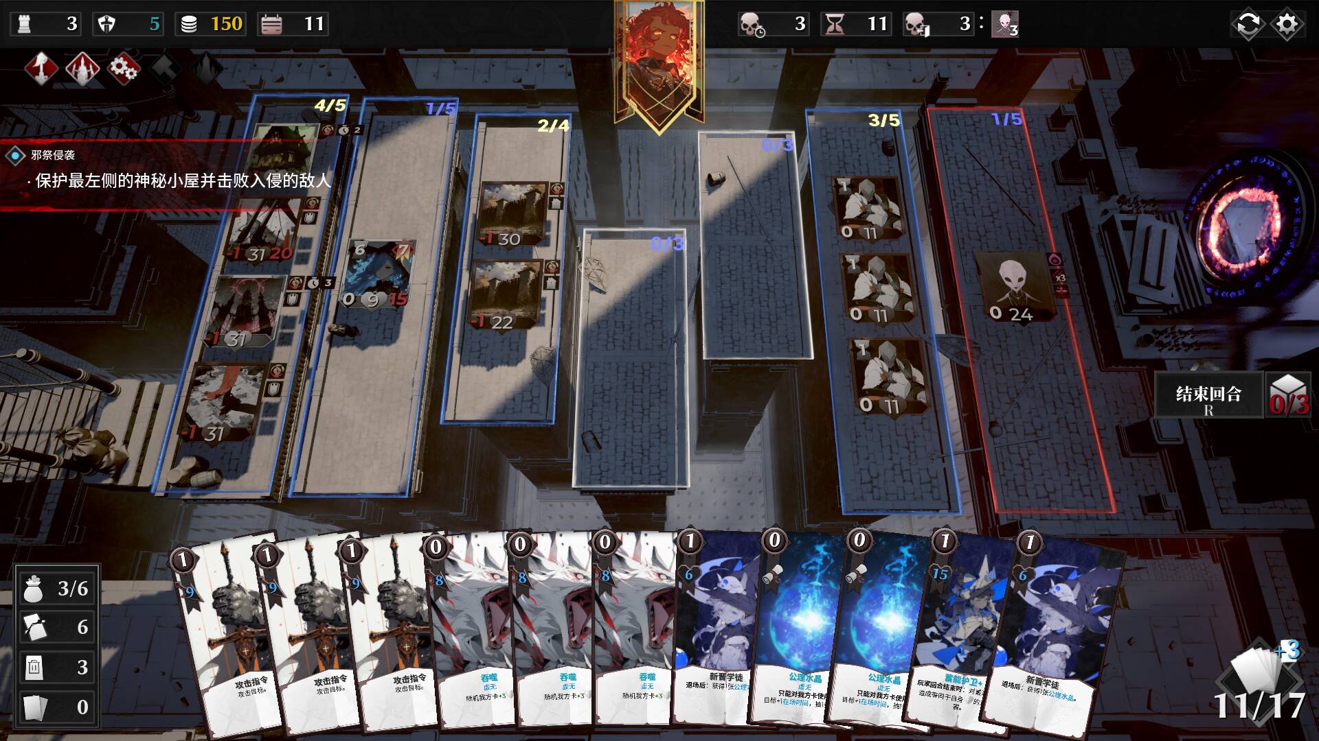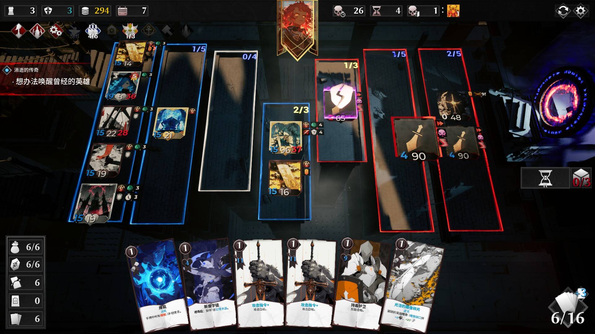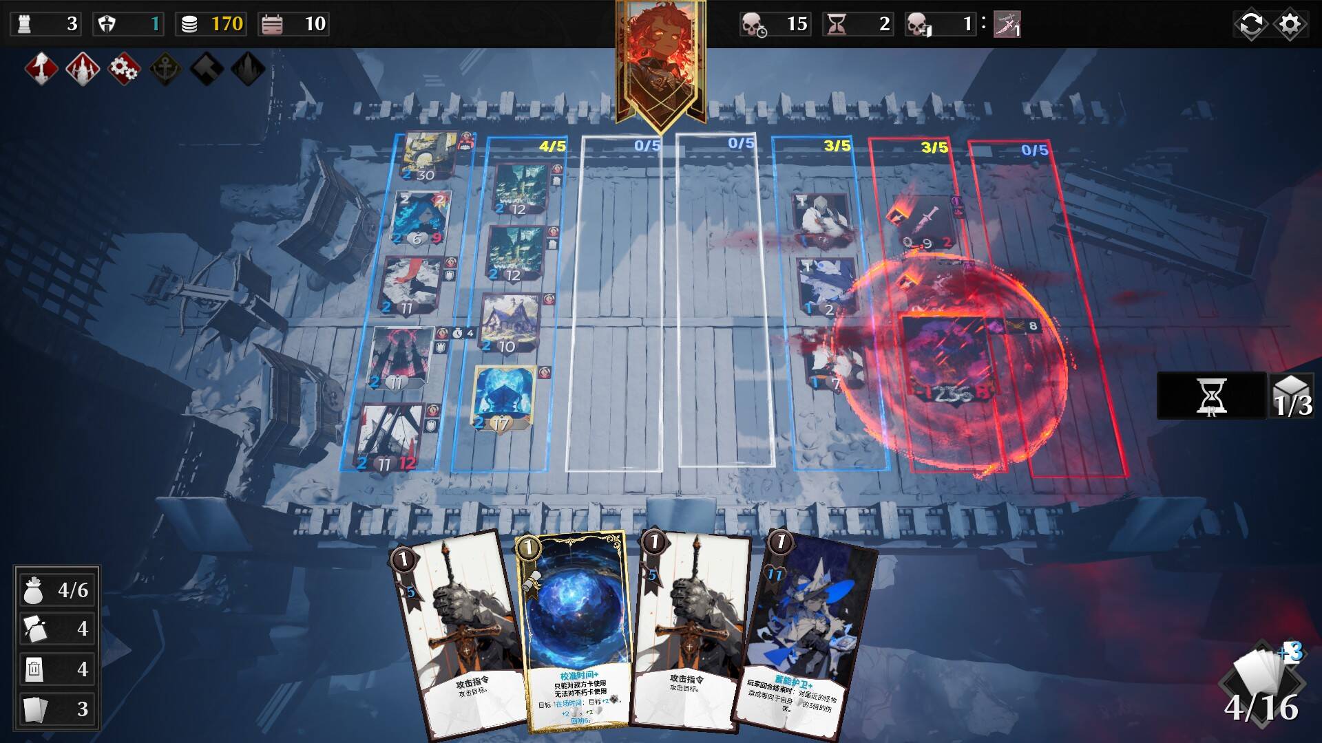 本作的核心玩法特别有趣,完全不是传统卡牌游戏双方出牌打伤害、互殴的情况,而是采用了“战线”的机制,玩家每回合需要花费资源布置士兵,阻止敌方靠近地图左边,而敌方则会源源不断地从地图右边派出兵力进行对峙,战场上就好似绞肉机一般推过来推过去。