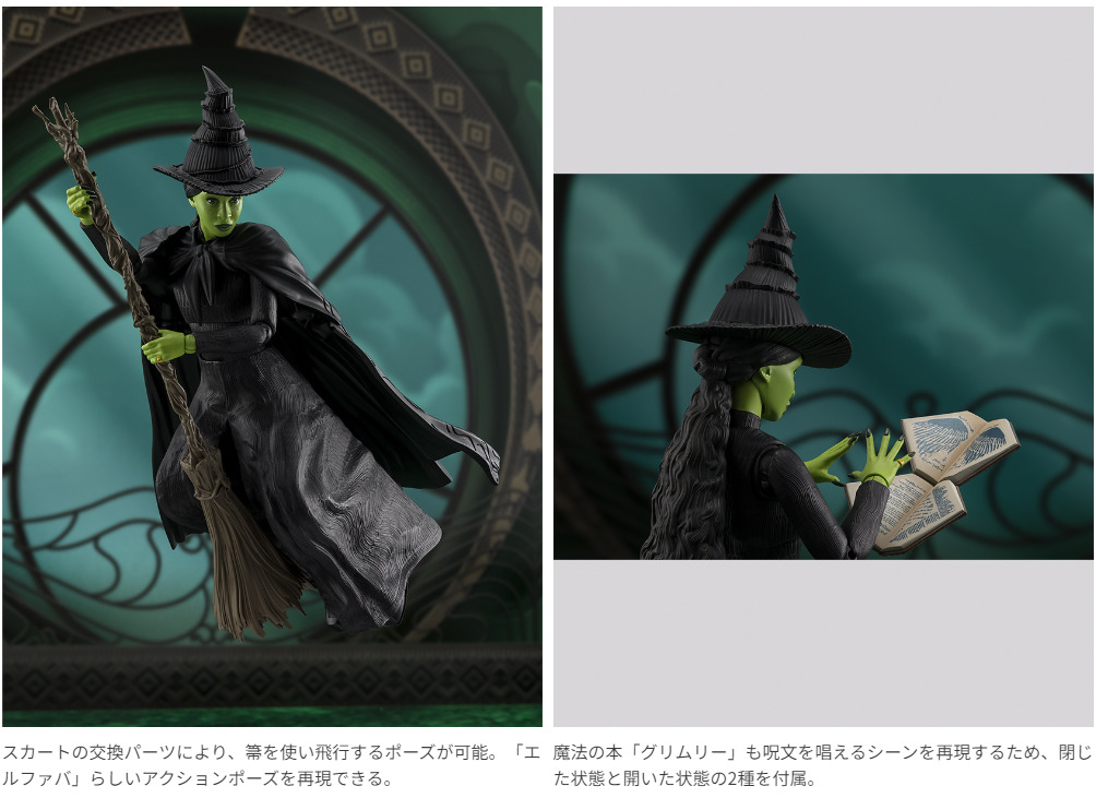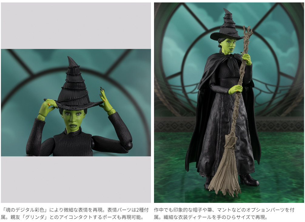 <オズの国>で“悪い魔女”となった「エルファバ」の象徴的なグリーンの肌と漆黒のドレスとケープ、そして「グリンダ」から贈られた帽子など、様々なオプションパーツで作品の世界観を手のひらサイズで再現。「魂のデジタル彩色」による繊細な表情パーツも全3種付属。箒に跨り空へと飛び立つアクションポーズも再現可能。