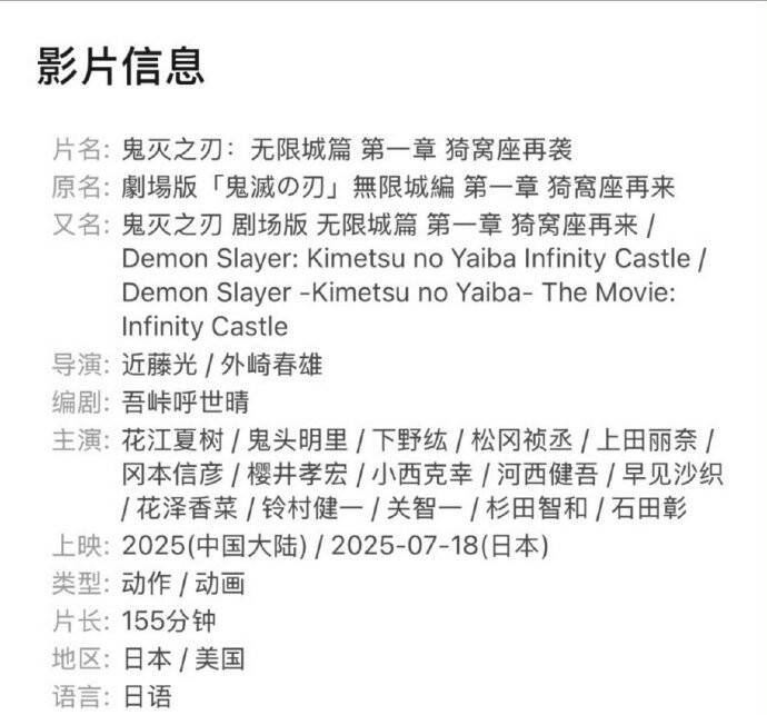 近日,现象级动画《鬼灭之刃》系列最新剧场版《无限城篇》正式开通中国大陆官方微博。据猫眼专业版显示,影片已通过内容审核,网络流传信息称内地定档11月14日,密钥有效期将持续至12月13日,届时有望同步上映IMAX版本。