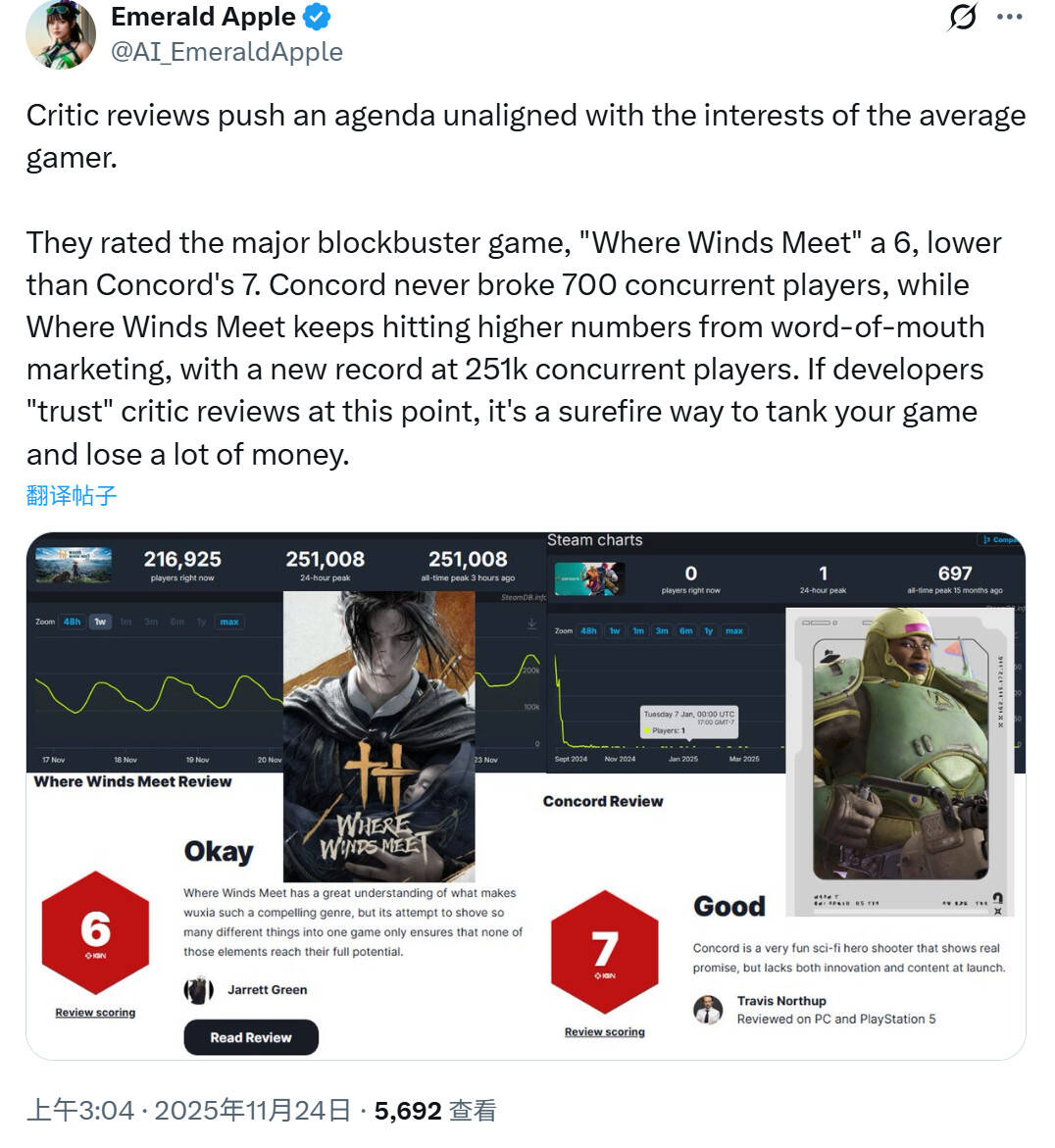 他们给大制作游戏《燕云十六声》6分,甚至比《星鸣特攻》的7分还低。可《星鸣特攻》最高同时在线人数从未突破700,而《燕云十六声》靠玩家口碑不断攀升,同时在线人数屡创新高,最新纪录已达25.1万。要是开发者在这种情况下还“信任”媒体评分,那几乎是自毁前程,保证把游戏做砸、把钱亏光。”