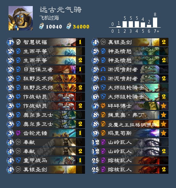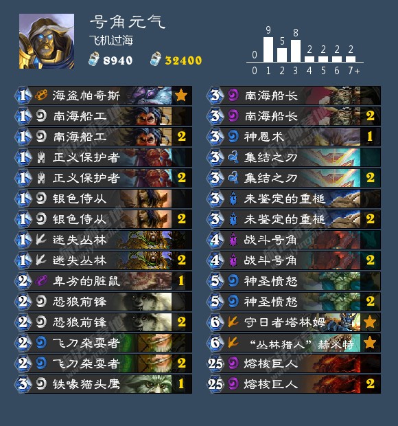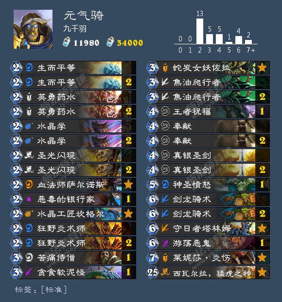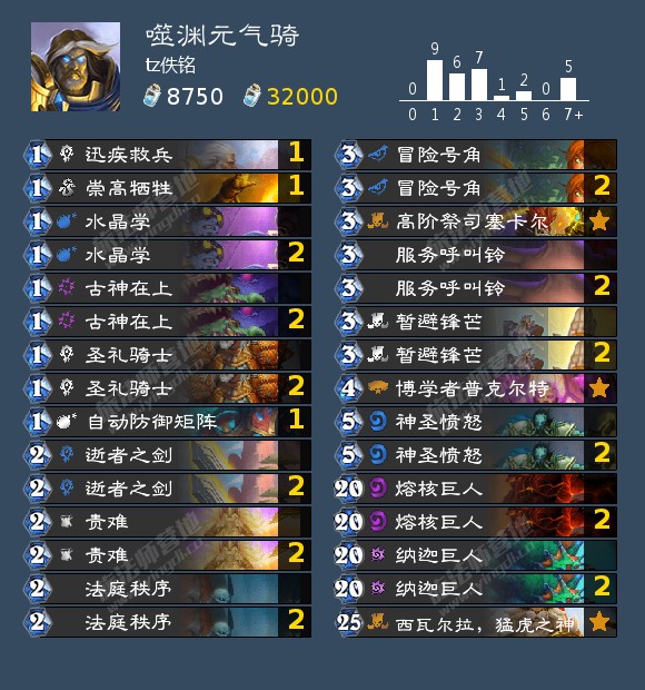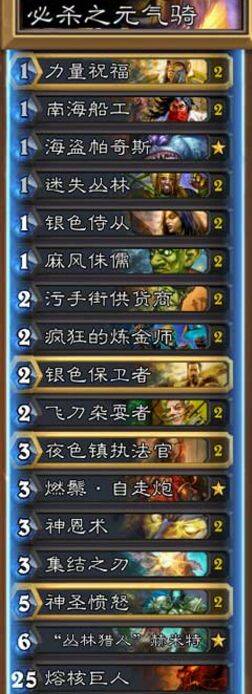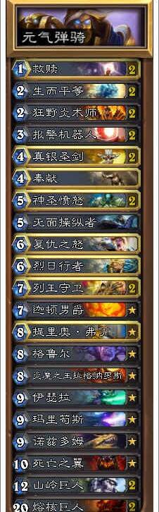到了炉石里,则摇身一变从群体aoe变成了单体直伤,且伤害直接与抽到的随从费用挂钩——与之匹配的正是费用高达20点的熔核巨人,就连卡牌趣闻也直接点明它就是神圣愤怒的最佳拍档。于是一套最初版元气骑应运而生,光是从构筑就能看出十分吃卡组羁绊,实际上也的确如此,启动率什么的暂且不提,哪怕打出了元气弹也不一定能赢。