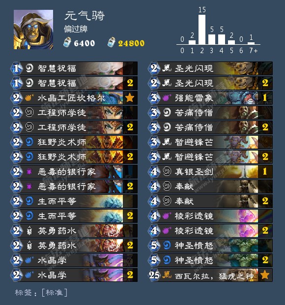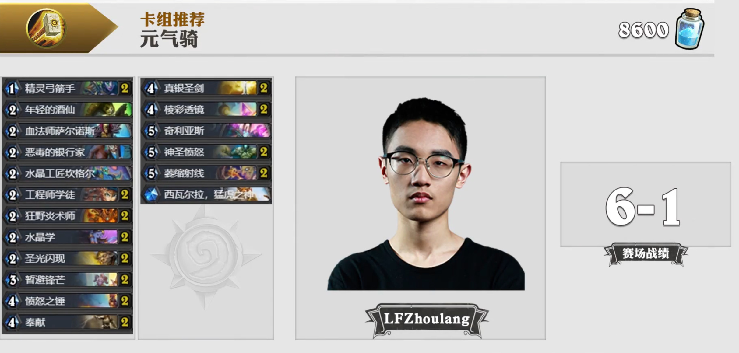 至此,元气骑完成了关键一跃——从一个靠天吃饭的娱乐卡组,蜕变为一个拥有多元终结手段的成熟体系,也正因其显著的稳定性与上限,该体系随即受到职业选手的推崇,成为赛场上的热门选择。而选手周郎就选择投入了精灵弓箭手来配合真银圣剑和神圣愤怒来达成“1+4+25 ”满血斩的构筑,真的很天才,也打出了6-1的斐然战绩。