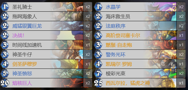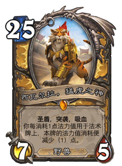 而在这一新体系主要衍生出两种截然不同的构筑方向。第一种是中速站场变体,核心思路是围绕随从与Buff手段建立场面优势,将神圣愤怒配合猛虎之神造成的25点斩杀作为终结比赛的可靠后手。